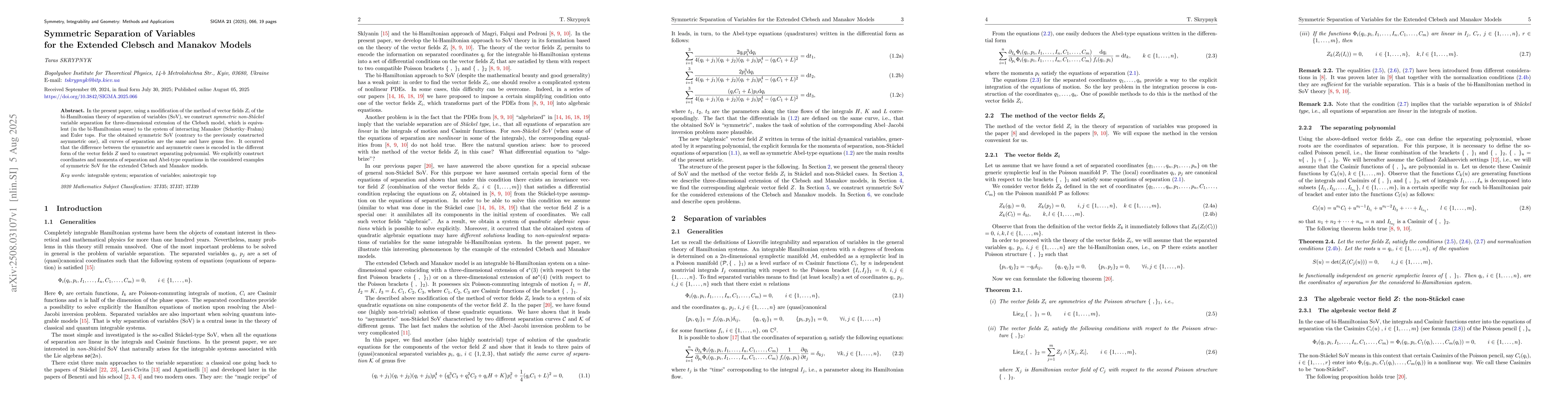 In the present paper, using a modification of the method of vector fields $Z_i$ of the bi-Hamiltonian theory of separation of variables (SoV), we construct symmetric non-St\"ackel variable separation for three-dimensional extension of the Clebsch model, which is equivalent (in the bi-Hamiltonian sense) to the system of interacting Manakov (Schottky-Frahm) and Euler tops. For the obtained symmetric SoV (contrary to the previously constructed asymmetric one), all curves of separation are the same and have genus five. It occurred that the difference between the symmetric and asymmetric cases is encoded in the different form of the vector fields $Z$ used to construct separating polynomial. We explicitly construct coordinates and momenta of separation and Abel-type equations in the considered examples of symmetric SoV for the extended Clebsch and Manakov models.