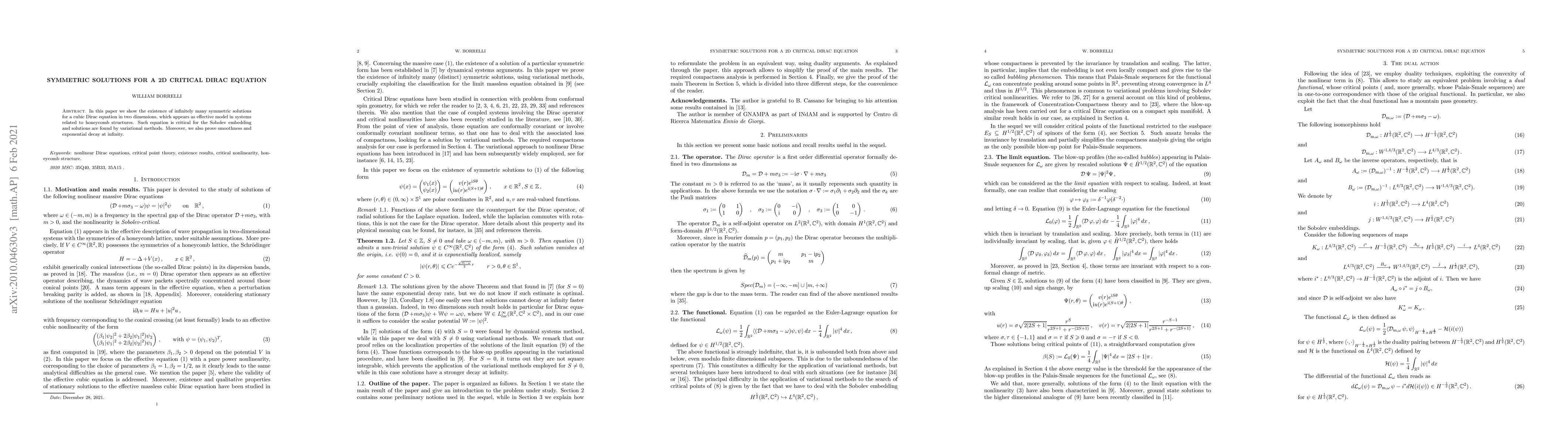In this paper we show the existence of infinitely many symmetric solutions for a cubic Dirac equation in two dimensions, which appears as effective model in systems related to honeycomb structures. Such equation is critical for the Sobolev embedding and solutions are found by variational methods. Moreover, we prove also prove smoothness and exponential decay at infinity.