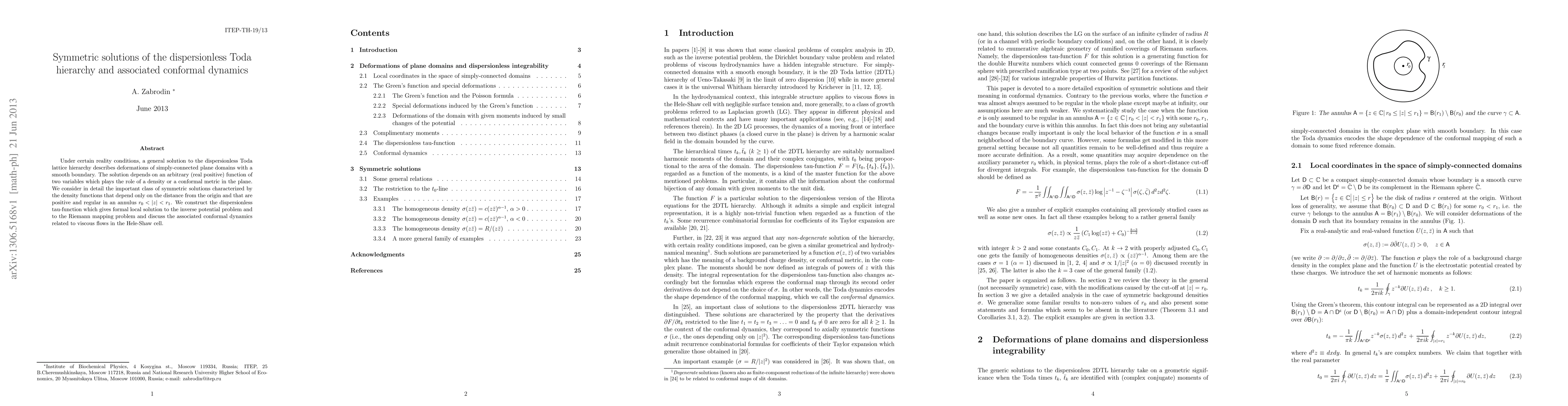 The research paper explores symmetric solutions to the dispersionless Toda hierarchy, which describe deformations of simply-connected plane domains with a smooth boundary. It provides formal local solutions to the inverse potential problem and the Riemann mapping problem, shedding light on associated conformal dynamics related to viscous flows in the Hele-Shaw cell.