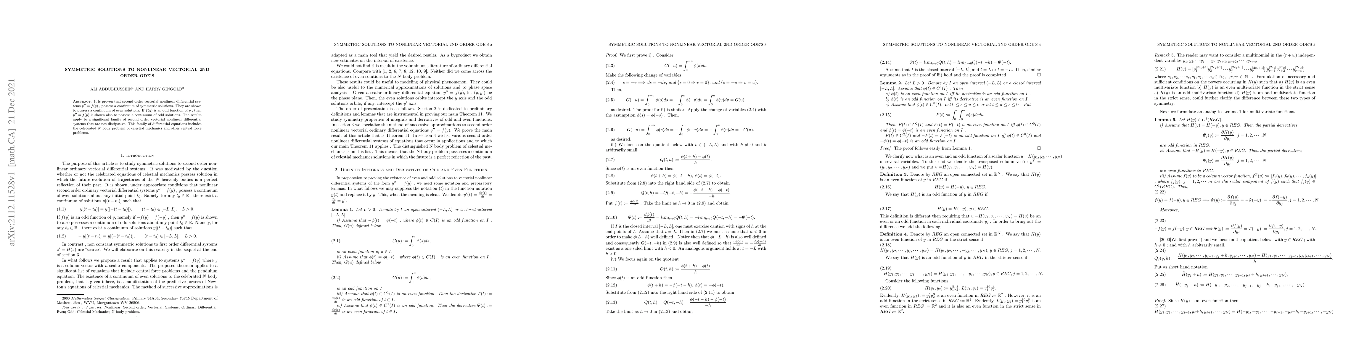 This paper demonstrates that second-order vectorial nonlinear differential systems, such as those in celestial mechanics, have a continuum of symmetric solutions, including even and odd solutions depending on the nature of the function f(y). The findings apply to a broad class of non-dissipative systems.