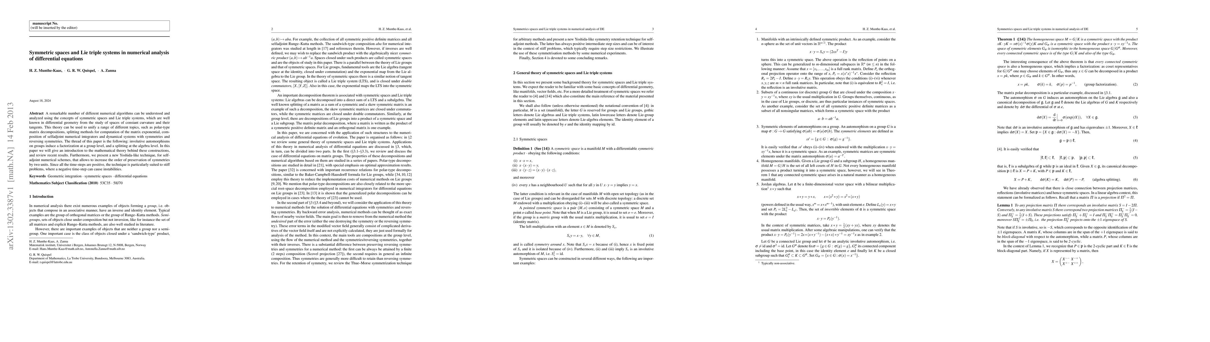 A remarkable number of different numerical algorithms can be understood and analyzed using the concepts of symmetric spaces and Lie triple systems, which are well known in differential geometry from the study of spaces of constant curvature and their tangents. This theory can be used to unify a range of different topics, such as polar-type matrix decompositions, splitting methods for computation of the matrix exponential, composition of selfadjoint numerical integrators and dynamical systems with symmetries and reversing symmetries. The thread of this paper is the following: involutive automorphisms on groups induce a factorization at a group level, and a splitting at the algebra level. In this paper we will give an introduction to the mathematical theory behind these constructions, and review recent results. Furthermore, we present a new Yoshida-like technique, for self-adjoint numerical schemes, that allows to increase the order of preservation of symmetries by two units. Since all the time-steps are positive, the technique is particularly suited to stiff problems, where a negative time-step can cause instabilities.