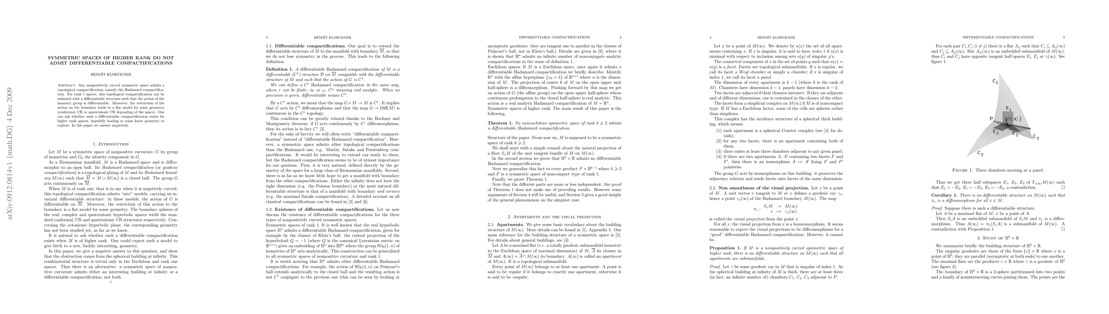 Any nonpositively curved symmetric space admits a topological compactification, namely the Hadamard compactification. For rank one spaces, this topological compactification can be endowed with a differentiable structure such that the action of the isometry group is differentiable. Moreover, the restriction of the action on the boundary leads to a flat model for some geometry (conformal, CR or quaternionic CR depending of the space). One can ask whether such a differentiable compactification exists for higher rank spaces, hopefully leading to some knew geometry to explore. In this paper we answer negatively.