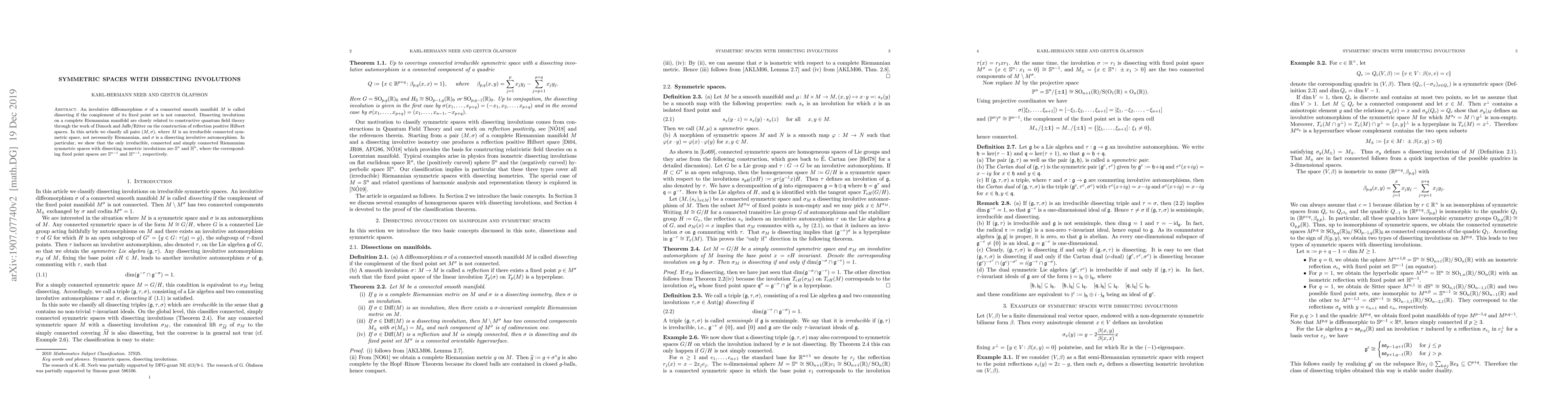 This paper classifies pairs of irreducible symmetric spaces $M$ and dissecting involutions $\sigma$, showing that the only $1$-connected Riemannian cases are $S^n$ and $H^n$ with fixed point sets $S^{n-1}$ and $H^{n-1}$, respectively. The study is significant for its implications in constructive quantum field theory.