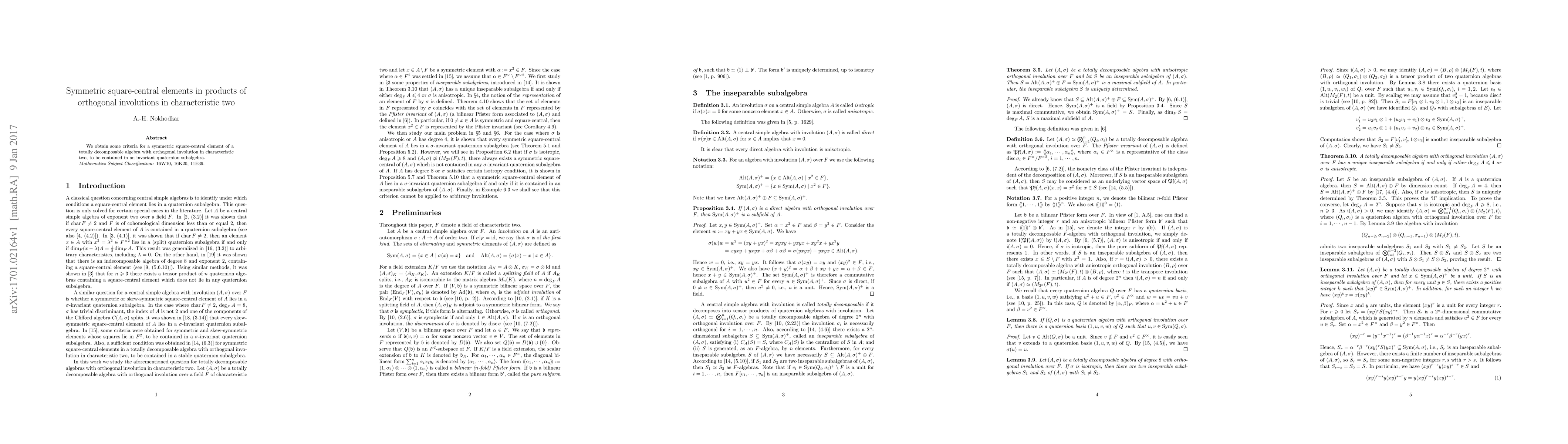 We obtain some criteria for a symmetric square-central element of a totally decomposable algebra with orthogonal involution in characteristic two, to be contained in an invariant quaternion subalgebra.