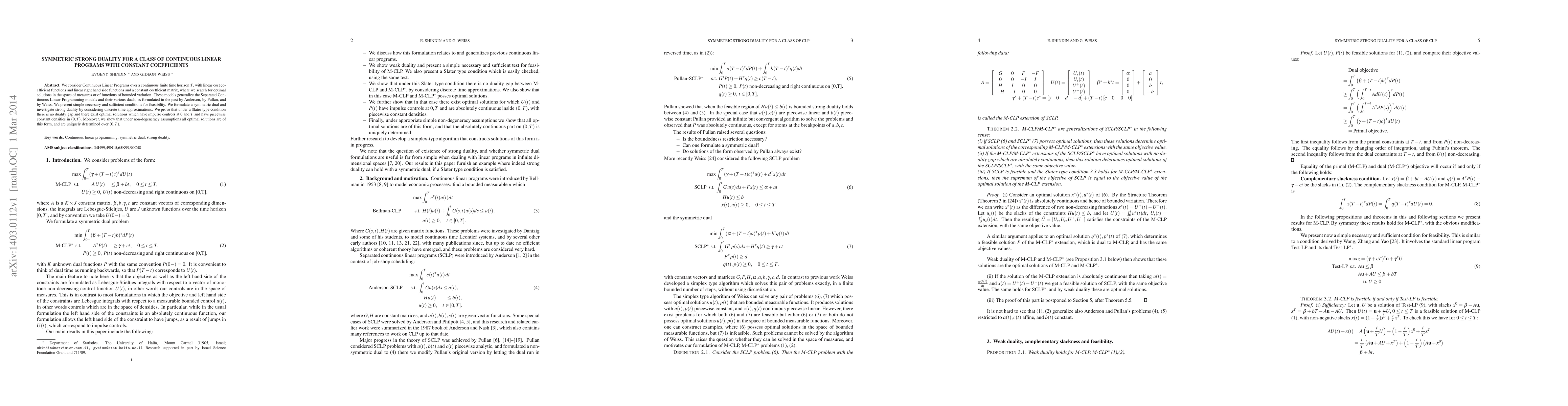 This paper explores Continuous Linear Programs with constant coefficients, presenting necessary and sufficient conditions for feasibility and a symmetric dual. It proves strong duality under a Slater type condition, showing that optimal solutions exhibit impulse controls at the endpoints and have piecewise constant densities.