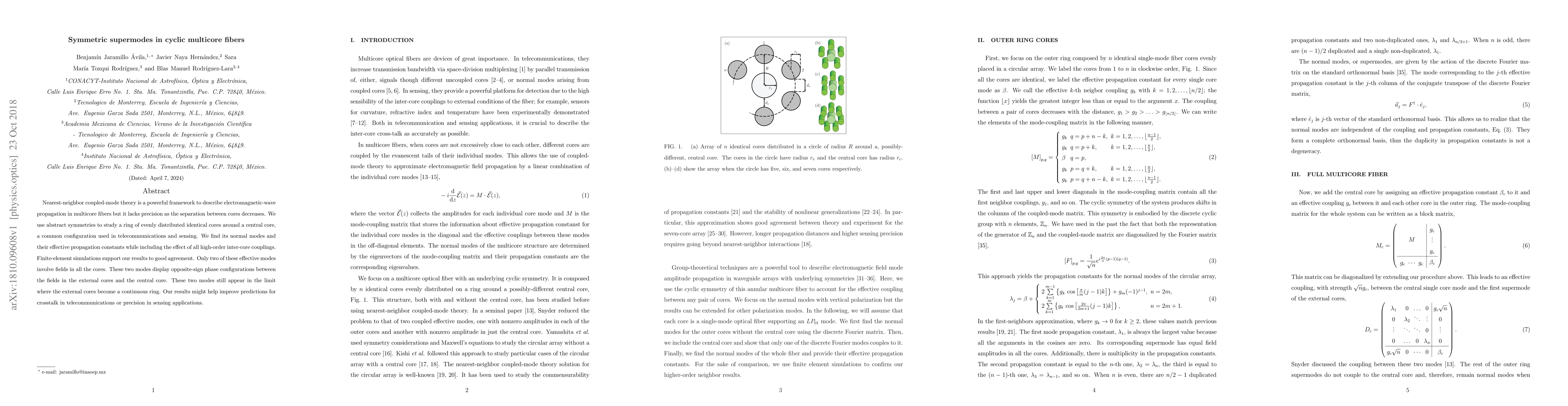 This paper investigates symmetric supermodes in cyclic multicore fibers using abstract symmetries and coupled-mode theory, revealing two key modes with opposite-sign phase configurations between external and central cores. Finite-element simulations validate the findings, which could enhance crosstalk predictions and sensing precision in telecommunications.