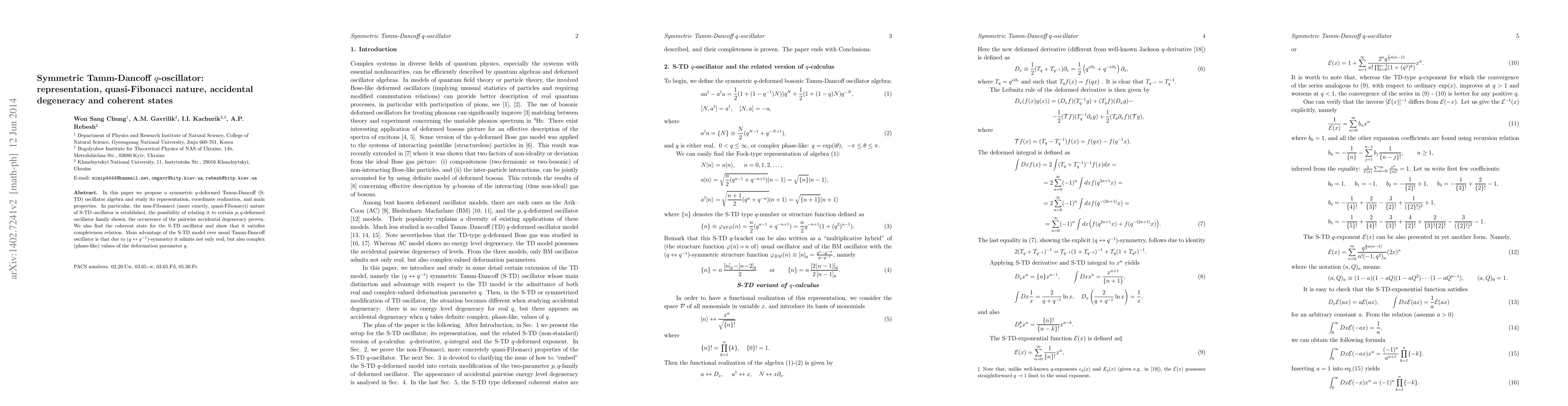 This paper introduces a symmetric q-deformed Tamm-Dancoff (S-TD) oscillator algebra, demonstrating its quasi-Fibonacci nature, accidental degeneracy, and coherent state representation. The S-TD oscillator's (q<-->q^{-1})-symmetry allows for both real and complex deformation parameters, offering advantages over traditional models.