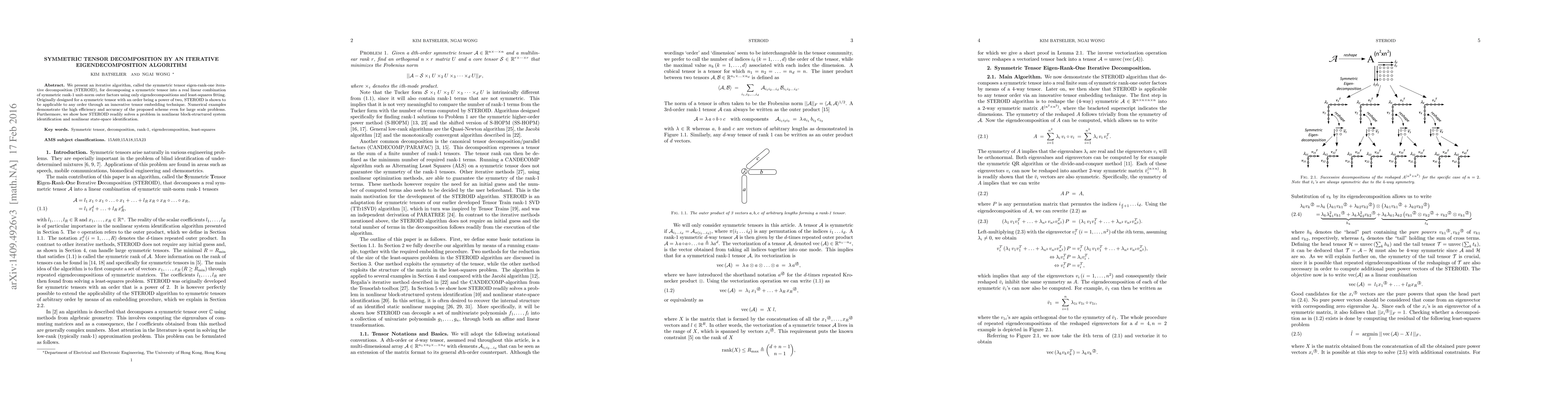 This paper introduces STEROID, an iterative algorithm for decomposing symmetric tensors into rank-1 unit-norm factors using eigendecompositions and least-squares fitting. The method is initially designed for tensors of order powers of two but is extended to any order via tensor embedding, demonstrating efficiency and accuracy in large-scale applications.