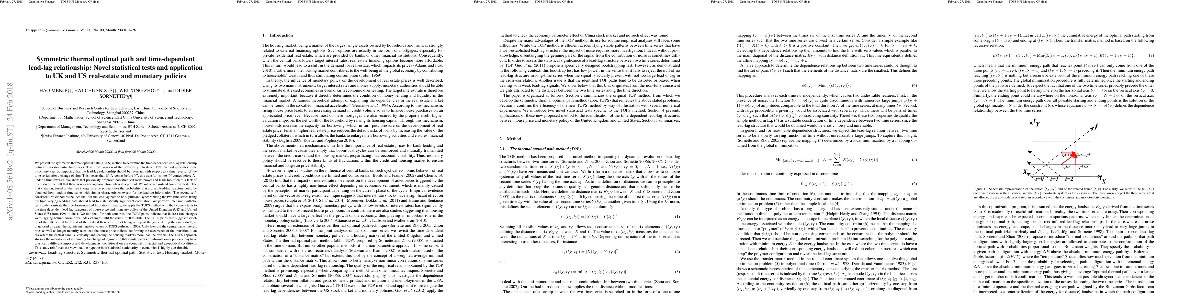This paper introduces the symmetric thermal optimal path (TOPS) method to determine time-dependent lead-lag relationships between two stochastic time series, proposing two novel statistical tests to replace the ineffective bootstrap test. The TOPS method is applied to UK and US real-estate and monetary policies, highlighting the importance of regime changes and questioning the assumption of statistical stationarity.