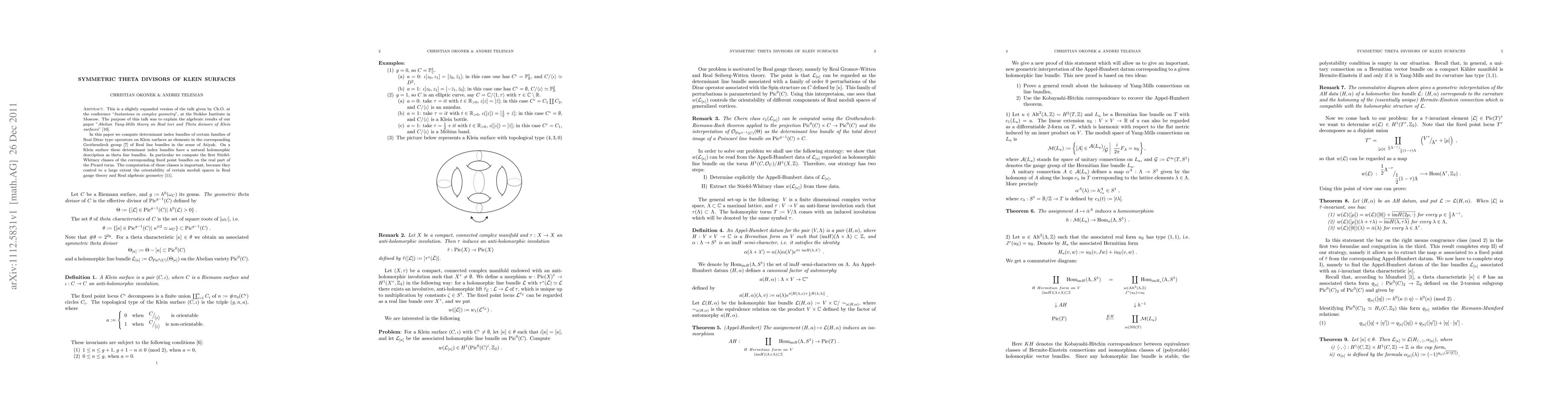 This is a slightly expanded version of the talk given by Ch.O. at the conference "Instantons in complex geometry", at the Steklov Institute in Moscow. The purpose of this talk was to explain the algebraic results of our paper "Abelian Yang-Mills theory on Real tori and Theta divisors of Klein surfaces". In this paper we compute determinant index bundles of certain families of Real Dirac type operators on Klein surfaces as elements in the corresponding Grothendieck group of Real line bundles in the sense of Atiyah. On a Klein surface these determinant index bundles have a natural holomorphic description as theta line bundles. In particular we compute the first Stiefel-Whitney classes of the corresponding fixed point bundles on the real part of the Picard torus. The computation of these classes is important, because they control to a large extent the orientability of certain moduli spaces in Real gauge theory and Real algebraic geometry.