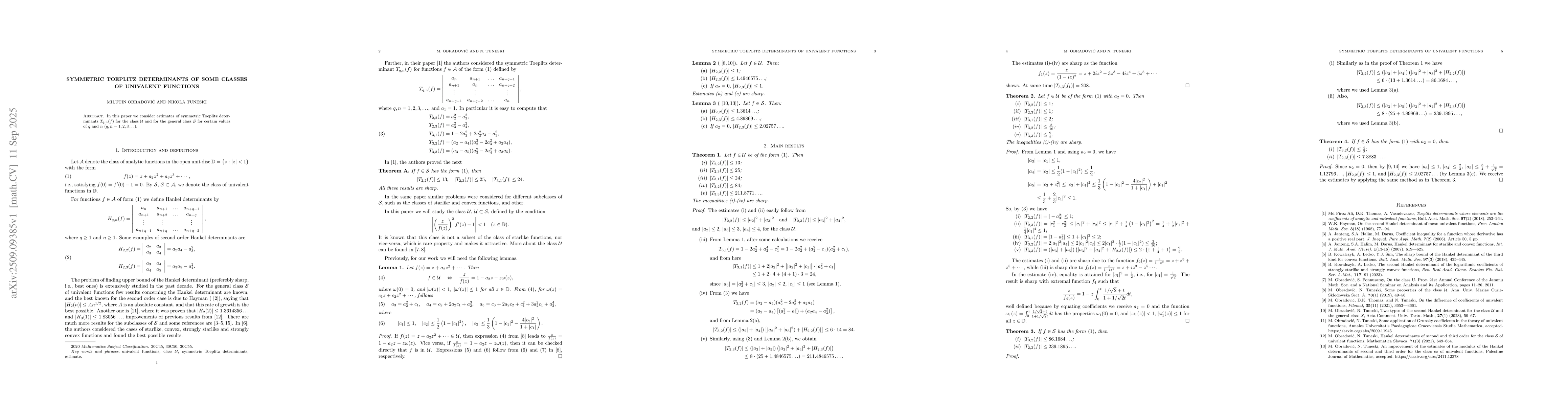 In this paper, we consider estimates of symmetric Toeplitz determinants $T_{q,n}(f)$ for the class ${\mathcal U}$ and for the general class ${\mathcal S}$ for certain values of $q$ and $n$ ($q,n=1,2,3\ldots$).