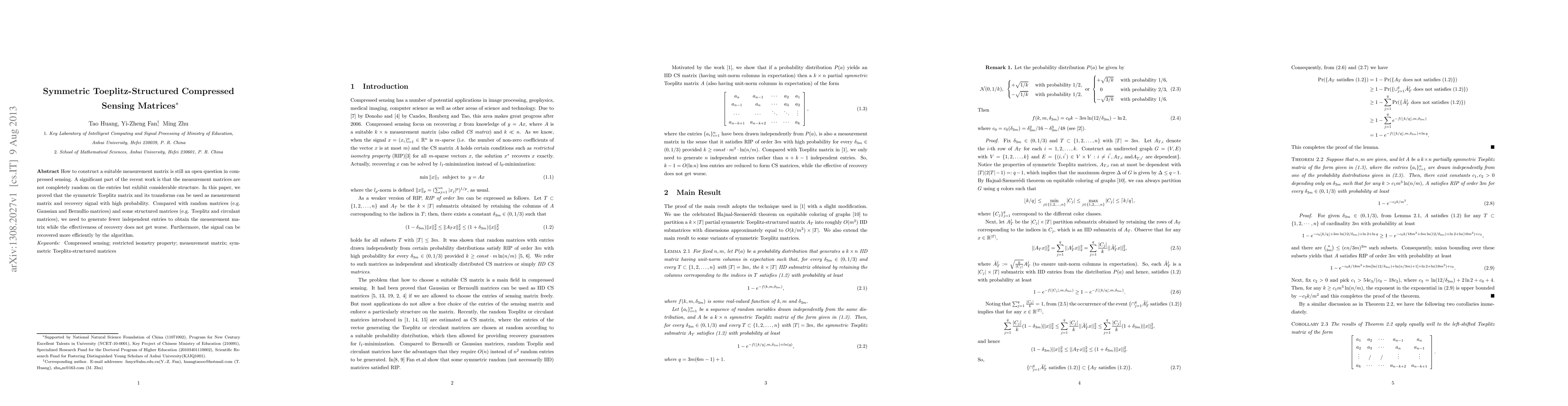 How to construct a suitable measurement matrix is still an open question in compressed sensing. A significant part of the recent work is that the measurement matrices are not completely random on the entries but exhibit considerable structure. In this paper, we proved that the symmetric Toeplitz matrix and its transforms can be used as measurement matrix and recovery signal with high probability. Compared with random matrices (e.g. Gaussian and Bernullio matrices) and some structured matrices (e.g. Toeplitz and circulant matrices), we need to generate fewer independent entries to obtain the measurement matrix while the effectiveness of recovery does not get worse. Furthermore, the signal can be recovered more efficiently by the algorithm.