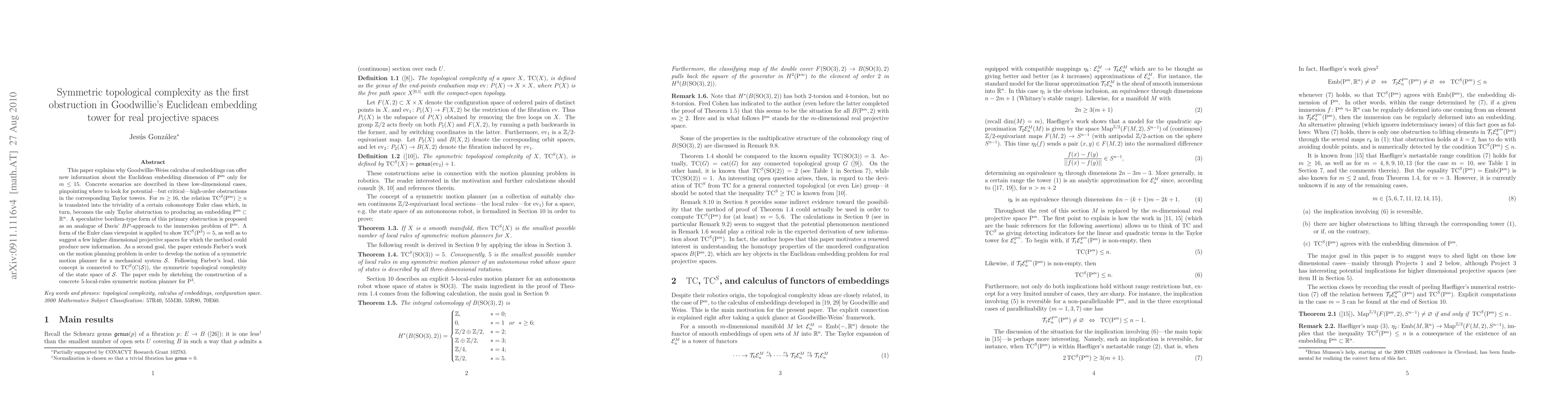 As a first goal, it is explained why Goodwillie-Weiss calculus of embeddings offers new information about the Euclidean embedding dimension of P^m only for m < 16. Concrete scenarios are described in these low-dimensional cases, pinpointing where to look for potential, but critical, high-order obstructions in the corresponding Taylor towers. For m > 15, the relation TC^S(P^m) > n-1 is translated into the triviality of a certain cohomotopy Euler class which, in turn, becomes the only Taylor obstruction to producing an n-dimensional Euclidean embedding of P^m. A speculative bordism-type form of this primary obstruction is proposed as an analogue of Davis' BP-approach to the immersion problem of P^m. A form of the Euler class viewpoint is applied to show TC^S(P^3) = 5, as well as to suggest a few higher dimensional projective spaces for which the method could produce new information. As a second goal, the paper extends Farber's work on the motion planning problem in order to develop the notion of a symmetric motion planner for a mechanical system S. Following Farber's lead, this concept is connected to the symmetric topological complexity of the state space of S. The paper ends by sketching the construction of a concrete 5-local-rules symmetric motion planner for P^3.