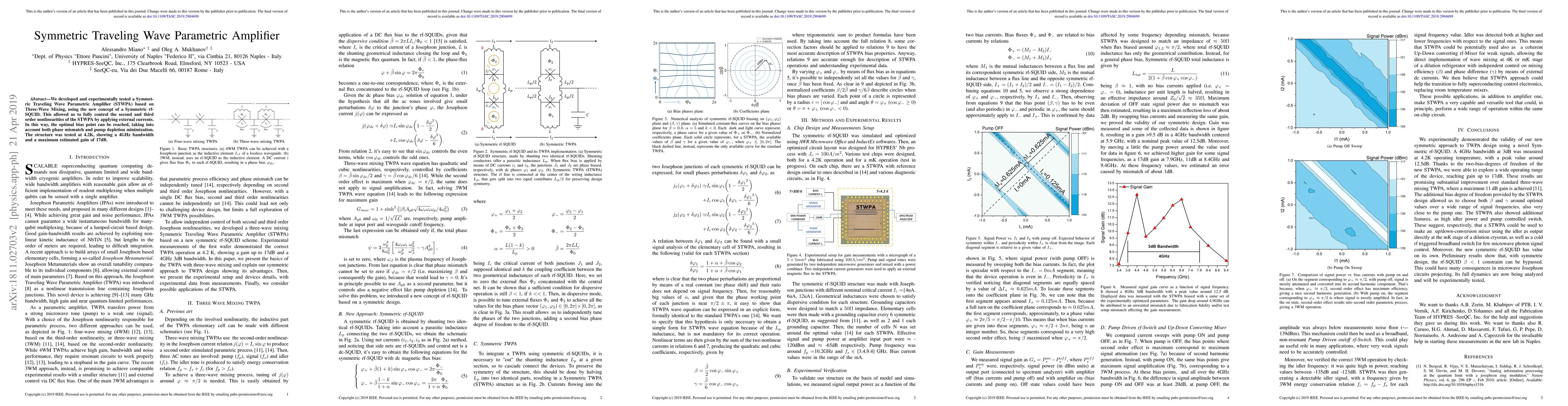 The research developed and tested a Symmetric Traveling Wave Parametric Amplifier (STWPA) utilizing Three-Wave Mixing and a Symmetric rf-SQUID, achieving a 4GHz bandwidth and 17dB gain while minimizing phase mismatch and pump depletion. The STWPA demonstrated flexibility for both up-down conversion and rf-controlled switching.