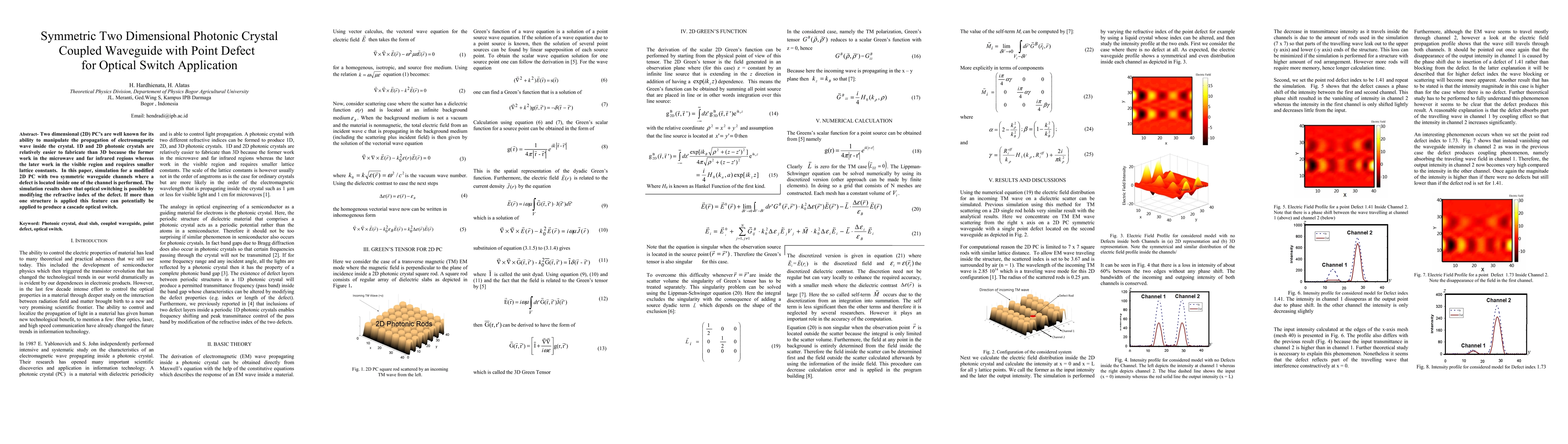 Two dimensional (2D) photonic crystals are well known for its ability to manipulate the propagation of electromagnetic wave inside the crystal. 1D and 2D photonic crystals are relatively easier to fabricate than 3D because the former work in the microwave and far infrared regions whereas the later work in the visible region and requires smaller lattice constants. In this paper, simulation for a modified 2D PC with two symmetric waveguide channels where a defect is located inside one of the channel is performed. The simulation results show that optical switching is possible by modifying the refractive index of the defect. If more than one structure is applied this feature can potentially be applied to produce a cascade optical switch.