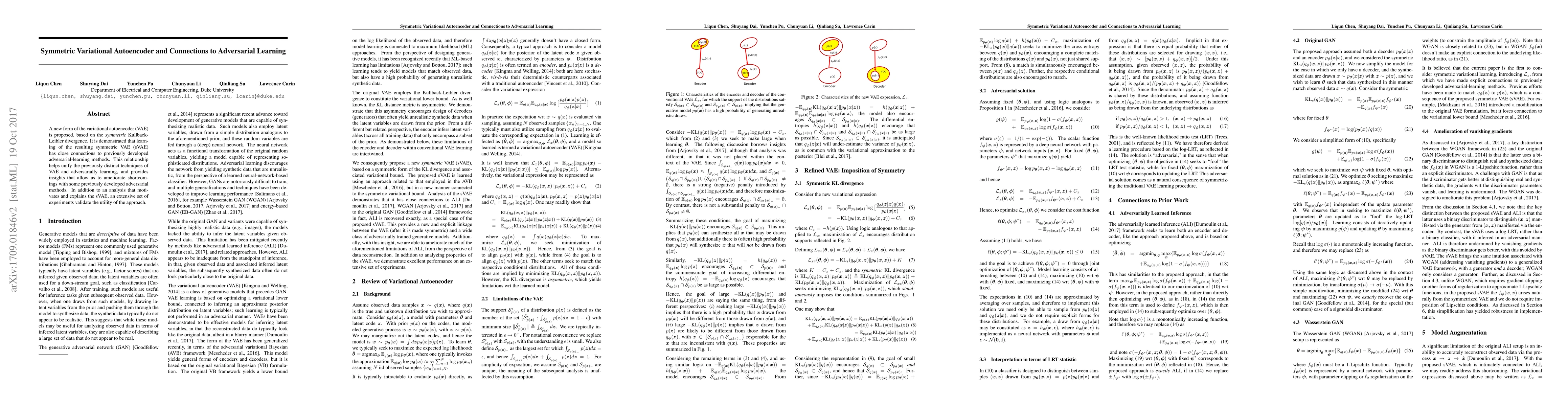 This paper introduces a symmetric variational autoencoder (sVAE) based on symmetric Kullback-Leibler divergence, revealing its connections to adversarial learning methods. The unified framework offers insights to improve existing adversarial techniques, validated through extensive experiments.