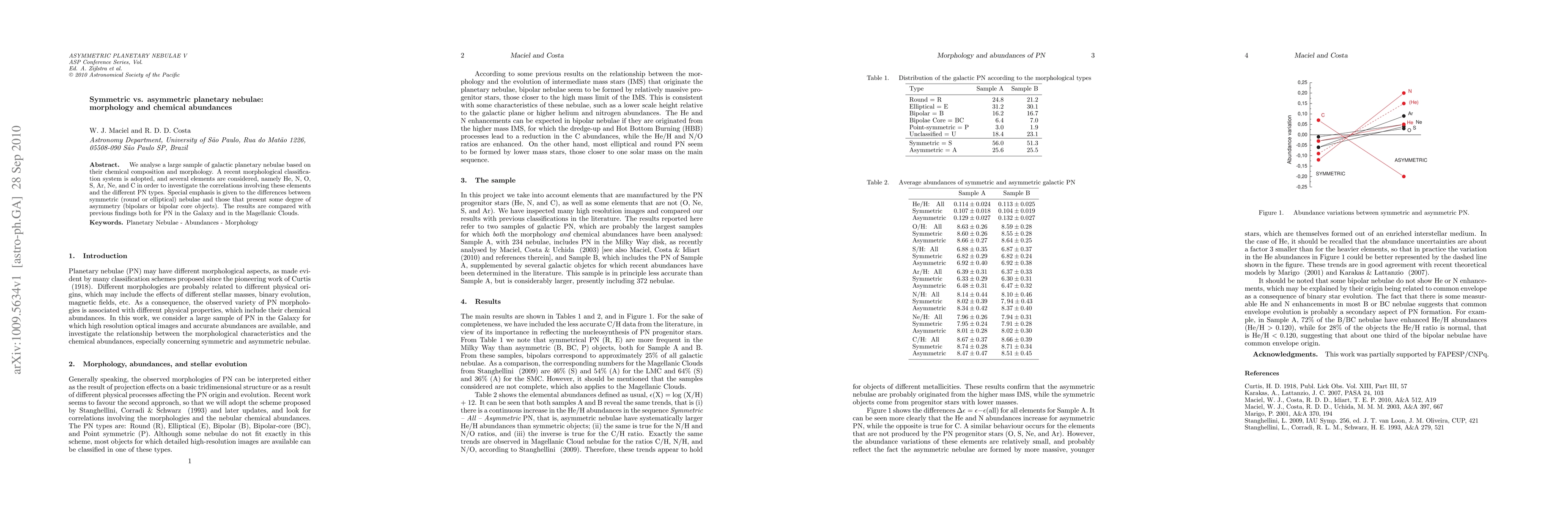 We analyse a large sample of galactic planetary nebulae based on their chemical composition and morphology. A recent morphological classification system is adopted, and several elements are considered, namely He, N, O, S, Ar, Ne, and C in order to investigate the correlations involving these elements and the different PN types. Special emphasis is given to the differences between symmetric (round or elliptical) nebulae and those that present some degree of asymmetry (bipolars or bipolar core objects). The results are compared with previous findings both for PN in the Galaxy and in the Magellanic Clouds.