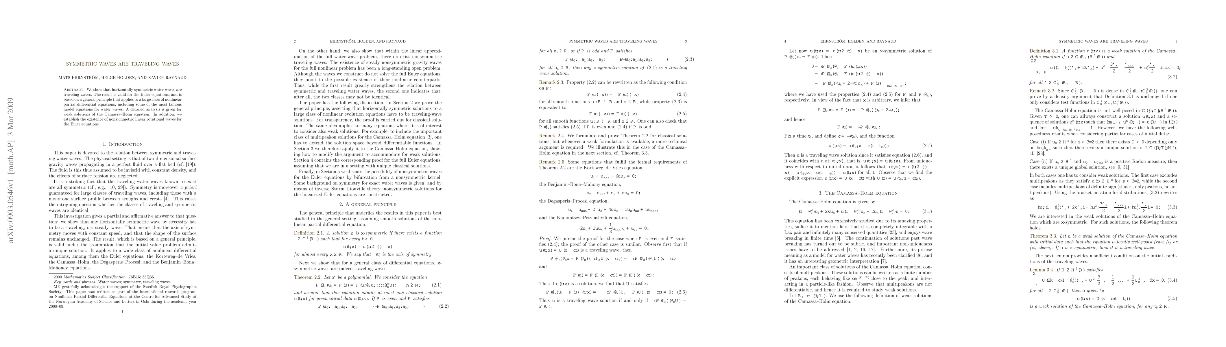 This paper demonstrates that horizontally symmetric water waves are inherently traveling waves, valid for the Euler equations and applicable to a broad range of nonlinear partial differential equations. It also establishes the existence of nonsymmetric linear rotational waves for the Euler equations, alongside a detailed analysis of weak solutions for the Camassa-Holm equation.