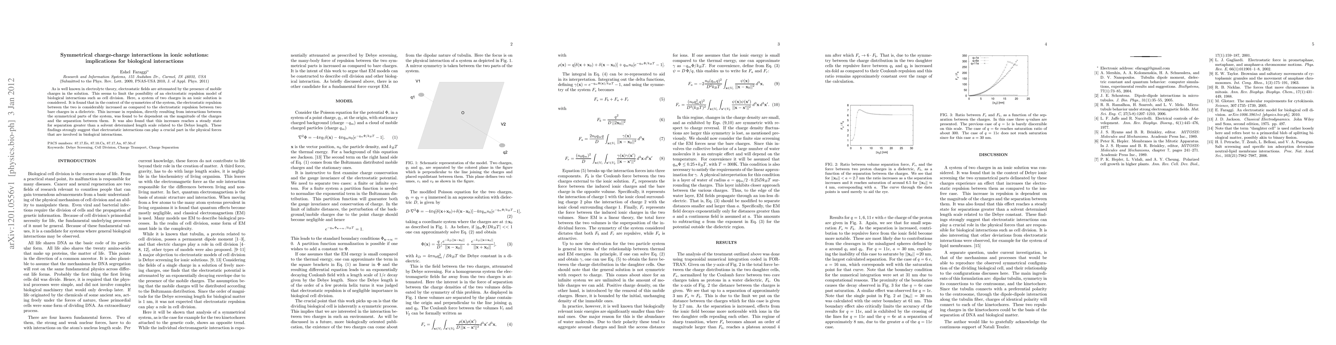 As is well known in electrolyte theory, electrostatic fields are attenuated by the presence of mobile charges in the solution. This seems to limit the possibility of an electrostatic repulsion model of biological interactions such as cell division. Here, a system of two charges in an ionic solution is considered. It is found that in the context of the symmetries of the system, the electrostatic repulsion between the two is considerably increased as compared to the electrostatic repulsion between two bare charges in a dielectric. This increase in repulsion, directly resulting from interactions between the symmetrical parts of the system, was found to be dependent on the magnitude of the charges and the separation between them. It was also found that this increases reaches a steady state for separation greater than a solvent determined length scale related to the Debye length. These findings strongly suggest that electrostatic interactions can play a crucial part in the physical forces that are involved in biological interactions.