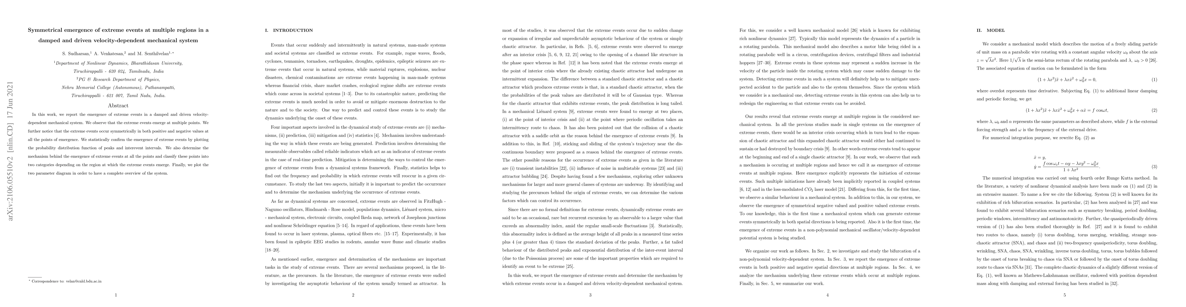 This paper investigates extreme events in a damped and driven velocity-dependent mechanical system, finding that these events emerge symmetrically in multiple regions. Statistical analysis confirms the occurrence and classifies the points of emergence based on the underlying mechanisms.