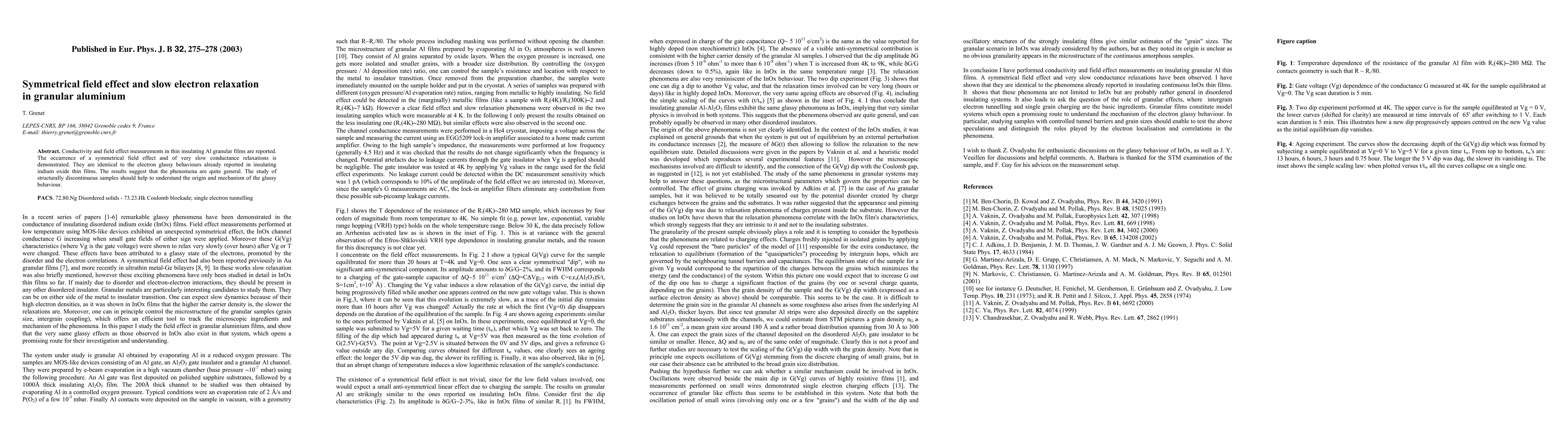 Researchers studied granular aluminium films and found symmetrical field effects and slow electron relaxations, similar to glassy behaviors in indium oxide films, suggesting these phenomena may be general and related to structural discontinuities.