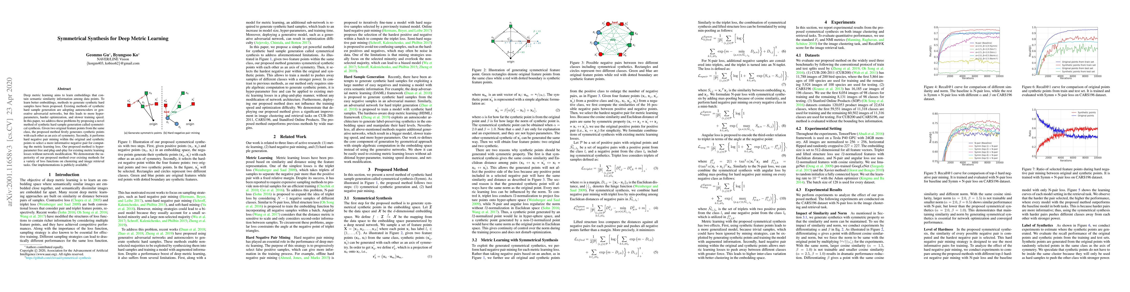 A new method called symmetrical synthesis is proposed to generate synthetic hard samples for deep metric learning, addressing issues of existing methods such as high hyper-parameter count, harder optimization, and slower training speed.