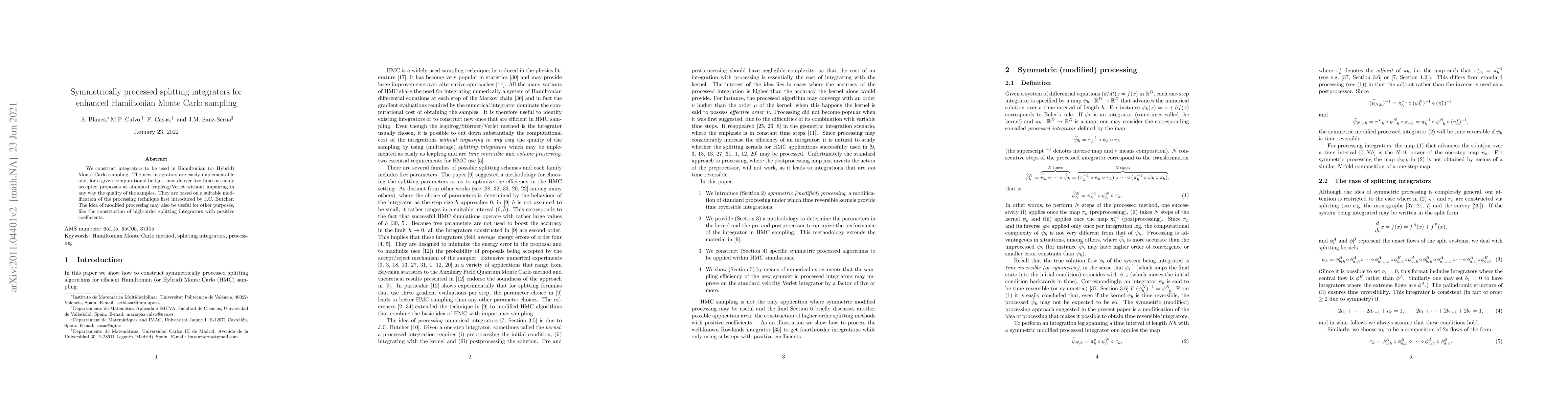 This paper proposes new symmetrically processed splitting integrators for Hamiltonian Monte Carlo sampling that can significantly increase the number of accepted proposals while maintaining sample quality, offering five times the efficiency of standard methods. The technique is based on a modified processing method by J.C. Butcher and may also aid in developing high-order splitting integrators.