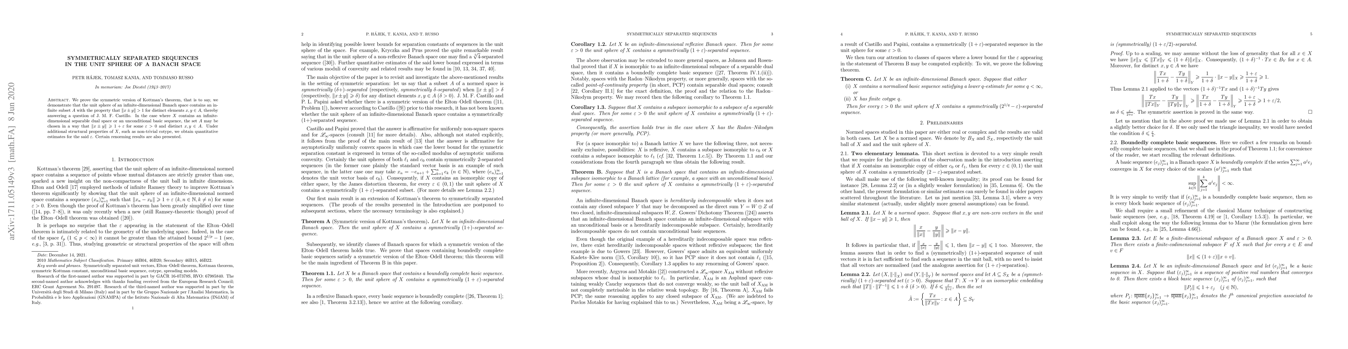 We prove the symmetric version of Kottman's theorem, that is to say, we demonstrate that the unit sphere of an infinite-dimensional Banach space contains an infinite subset $A$ with the property that $\|x\pm y\| > 1$ for distinct elements $x,y\in A$, thereby answering a question of J. M. F. Castillo. In the case where $X$ contains an infinite-dimensional separable dual space or an unconditional basic sequence, the set $A$ may be chosen in a way that $\|x\pm y\| \geqslant 1+\varepsilon$ for some $\varepsilon > 0$ and distinct $x,y\in A$. Under additional structural properties of $X$, such as non-trivial cotype, we obtain quantitative estimates for the said $\varepsilon$. Certain renorming results are also presented.