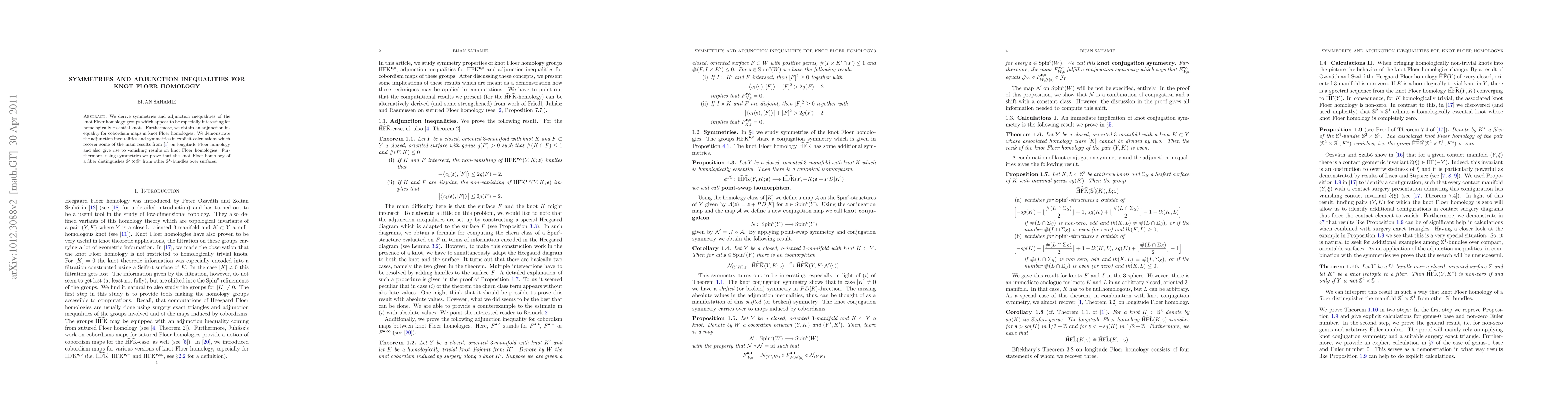 This paper derives symmetries and adjunction inequalities for knot Floer homology, particularly for homologically essential knots, and demonstrates these through explicit calculations that recover results from longitude Floer homology and distinguish $\stwo\times\sone$ bundles from other $\sone$-bundles over surfaces.
