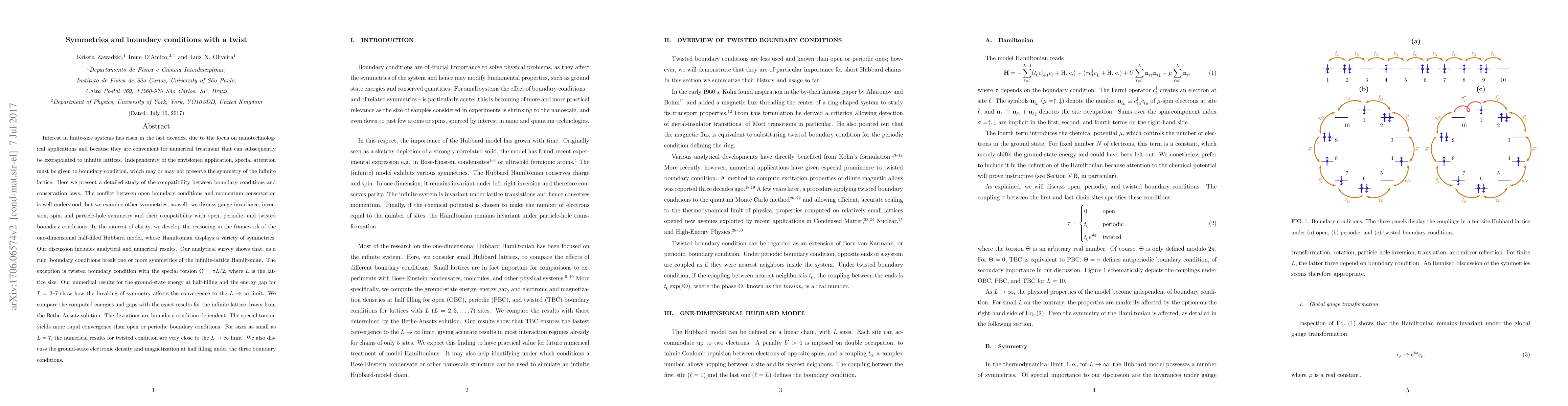 This paper investigates the compatibility of various boundary conditions with symmetries in finite-size systems, particularly the one-dimensional half-filled Hubbard model. It finds that while most boundary conditions break symmetries, the twisted boundary condition with $\Theta=\pi L/2$ preserves them, leading to faster convergence to the infinite lattice limit compared to open or periodic conditions.