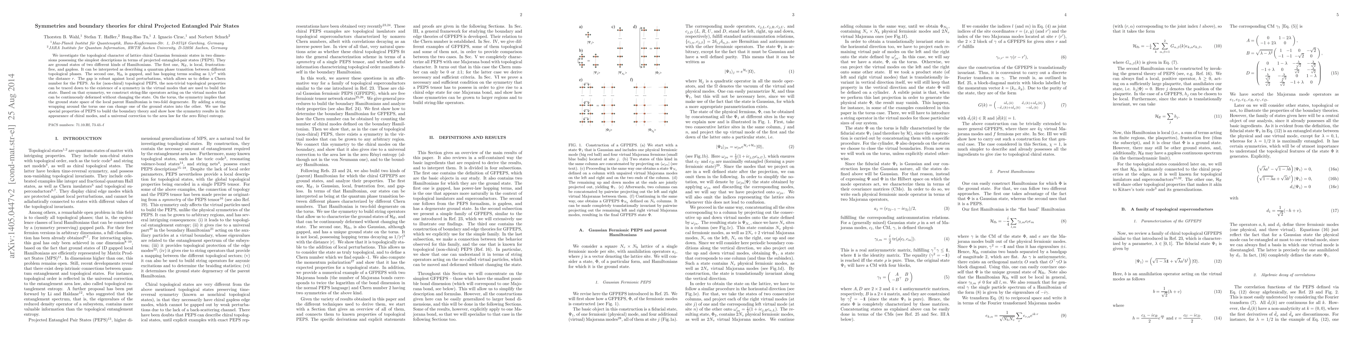 We investigate the topological character of lattice chiral Gaussian fermionic states in two dimensions possessing the simplest descriptions in terms of projected entangled-pair states (PEPS). They are ground states of two different kinds of Hamiltonians. The first one, $\mathcal H_\mathrm{ff}$, is local, frustration-free, and gapless. It can be interpreted as describing a quantum phase transition between different topological phases. The second one, $\mathcal H_\mathrm{fb}$ is gapped, and has hopping terms scaling as $1/r^3$ with the distance $r$. The gap is robust against local perturbations, which allows us to define a Chern number for the PEPS. As for (non-chiral) topological PEPS, the non-trivial topological properties can be traced down to the existence of a symmetry in the virtual modes that are used to build the state. Based on that symmetry, we construct string-like operators acting on the virtual modes that can be continuously deformed without changing the state. On the torus, the symmetry implies that the ground state space of the local parent Hamiltonian is two-fold degenerate. By adding a string wrapping around the torus one can change one of the ground states into the other. We use the special properties of PEPS to build the boundary theory and show how the symmetry results in the appearance of chiral modes, and a universal correction to the area law for the zero R\'{e}nyi entropy.