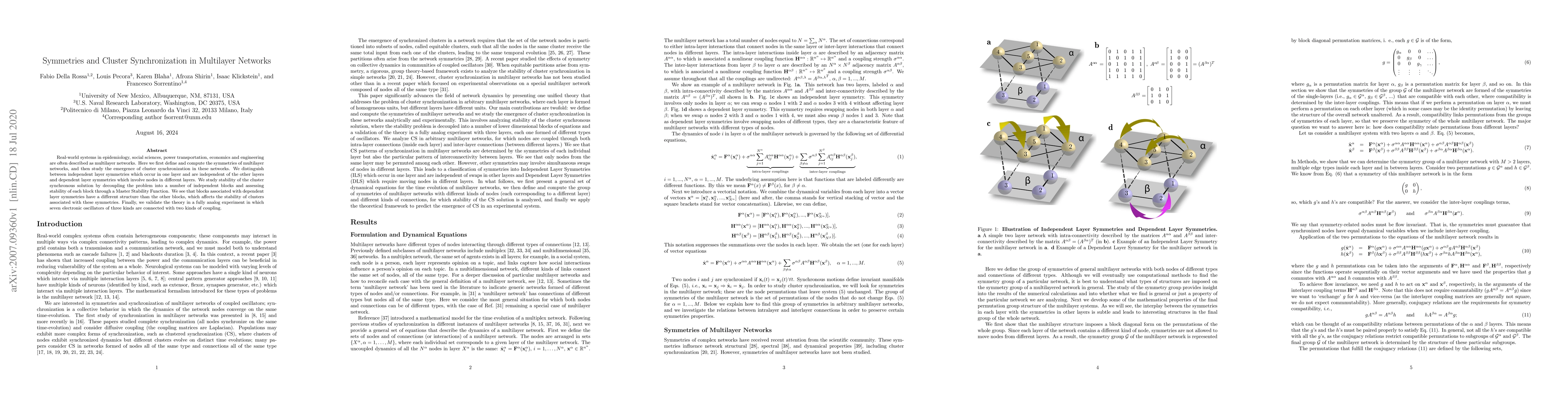 The research defines and computes symmetries of multilayer networks, distinguishing between independent and dependent layer symmetries. It studies cluster synchronization stability through Master Stability Function, decoupling the problem into independent blocks. The theory is validated via a fully analog experiment with seven electronic oscillators of three kinds connected with two kinds of coupling.