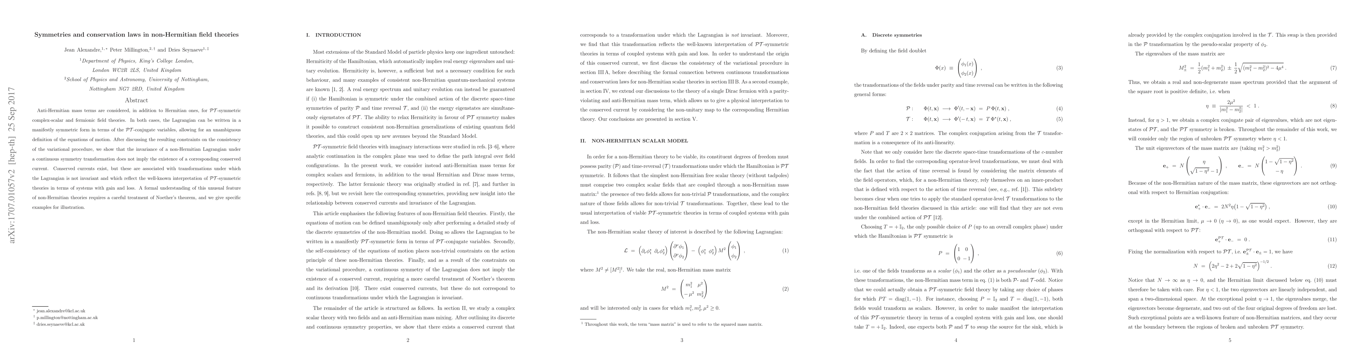 This research explores non-Hermitian field theories with both Hermitian and anti-Hermitian mass terms, demonstrating that continuous symmetry invariance doesn't ensure conserved currents. Conserved currents exist under non-invariant transformations, interpreted via PT-symmetric systems with gain and loss, requiring a revised Noether's theorem application.