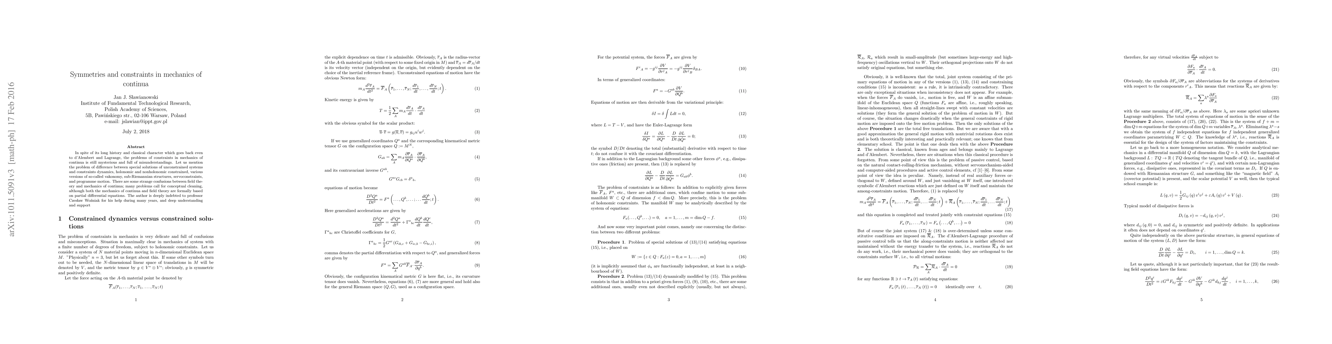 In spite of its long history and classical character which goes back even to d'Alembert and Lagrange, the problems of constraints in mechanics of continua is still mysterious and full of misunderstandings. Let us mention the problem of difference between special solutions of unconstrained systems and constraints dynamics, holonomic and nonholonomic constrained, various versions of so-called vakonomy, sub-Riemannian structures, servoconstraints, and programme motion. There are some strange confusions between field theory and mechanics of continua; many problems call for conceptual cleaning, although both the mechanics of continua and field theory are formally based on partial differential equations. The author is deeply indebted to professor Czes\law Wo\'{z}niak for his help during many years, and deep understanding and support.