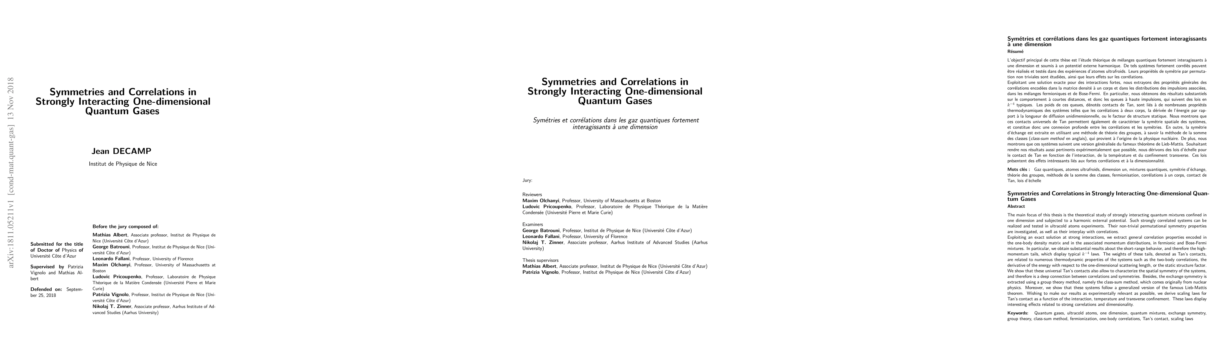 The main focus of this thesis is the theoretical study of strongly interacting quantum mixtures confined in one dimension and subjected to a harmonic external potential. Such strongly correlated systems can be realized and tested in ultracold atoms experiments. Their non-trivial permutational symmetry properties are investigated, as well as their interplay with correlations. Exploiting an exact solution at strong interactions, we extract general correlation properties encoded in the one-body density matrix and in the associated momentum distributions, in fermionic and Bose-Fermi mixtures. In particular, we obtain substantial results about the short-range behavior, and therefore the high-momentum tails, which display typical $k^{-4}$ laws. The weights of these tails, denoted as Tan's contacts, are related to numerous thermodynamic properties of the systems such as the two-body correlations, the derivative of the energy with respect to the one-dimensional scattering length, or the static structure factor. We show that these universal Tan's contacts also allow to characterize the spatial symmetry of the systems, and therefore is a deep connection between correlations and symmetries. Besides, the exchange symmetry is extracted using a group theory method, namely the class-sum method, which comes originally from nuclear physics. Moreover, we show that these systems follow a generalized version of the famous Lieb-Mattis theorem. Wishing to make our results as experimentally relevant as possible, we derive scaling laws for Tan's contact as a function of the interaction, temperature and transverse confinement. These laws display interesting effects related to strong correlations and dimensionality.