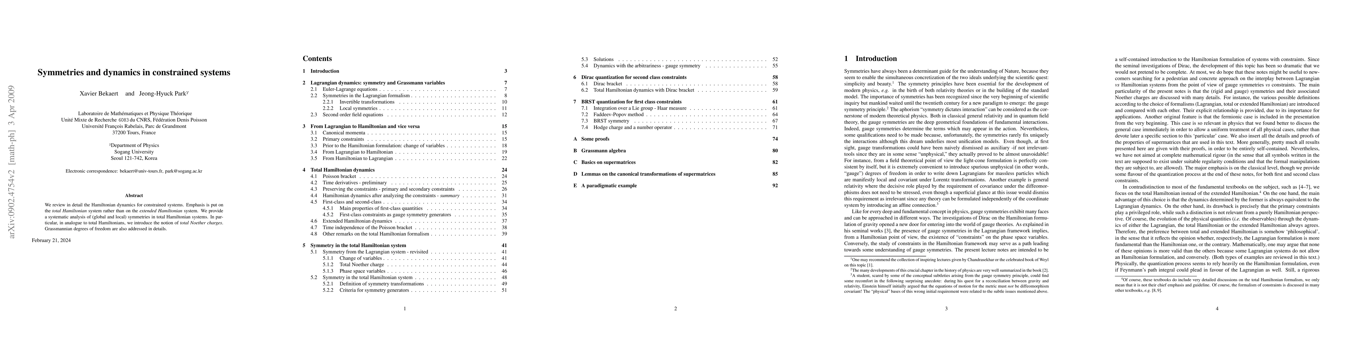 This paper reviews Hamiltonian dynamics for constrained systems, focusing on total Hamiltonians rather than extended ones. It systematically analyzes symmetries and introduces the concept of total Noether charges, alongside a detailed discussion on Grassmannian degrees of freedom.