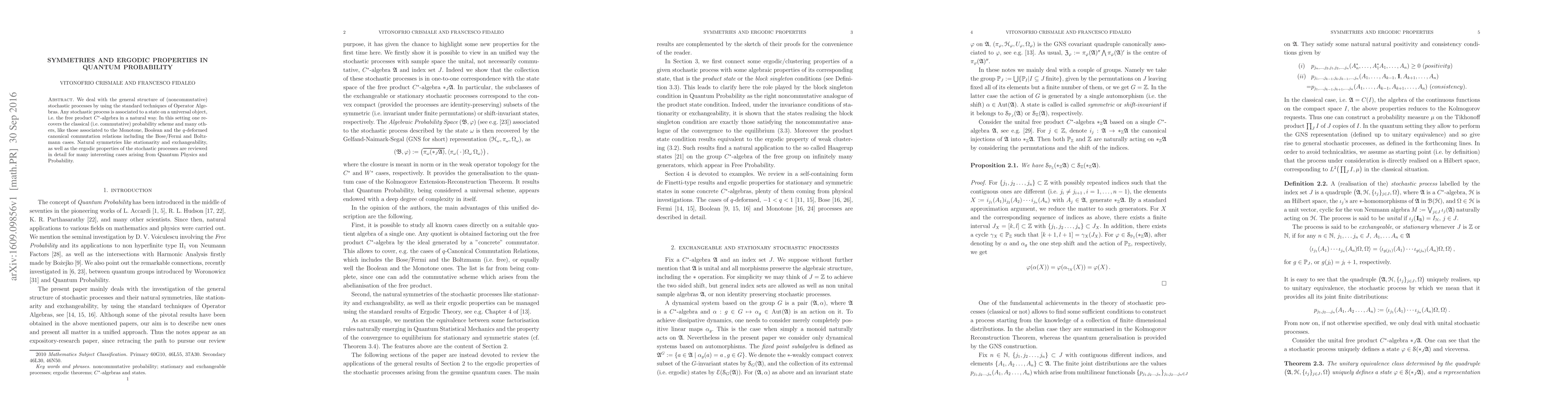 We deal with the general structure of (noncommutative) stochastic processes by using the standard techniques of Operator Algebras. Any stochastic process is associated to a state on a universal object, i.e. the free product $C^*$-algebra in a natural way. In this setting one recovers the classical (i.e. commutative) probability scheme and many others, like those associated to the Monotone, Boolean and the $q$-deformed canonical commutation relations including the Bose/Fermi and Boltzmann cases. Natural symmetries like stationarity and exchangeability, as well as the ergodic properties of the stochastic processes are reviewed in detail for many interesting cases arising from Quantum Physics and Probability.