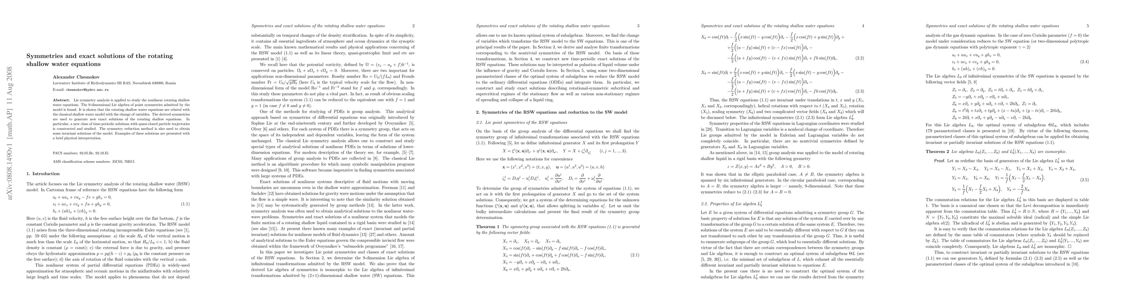 This paper utilizes Lie symmetry analysis to explore the symmetries of the rotating shallow water equations, identifying a 9-dimensional Lie algebra of point symmetries. It derives new exact solutions, including a class of time-periodic solutions with quasi-closed particle trajectories, and presents invariant solutions with brief physical interpretations.