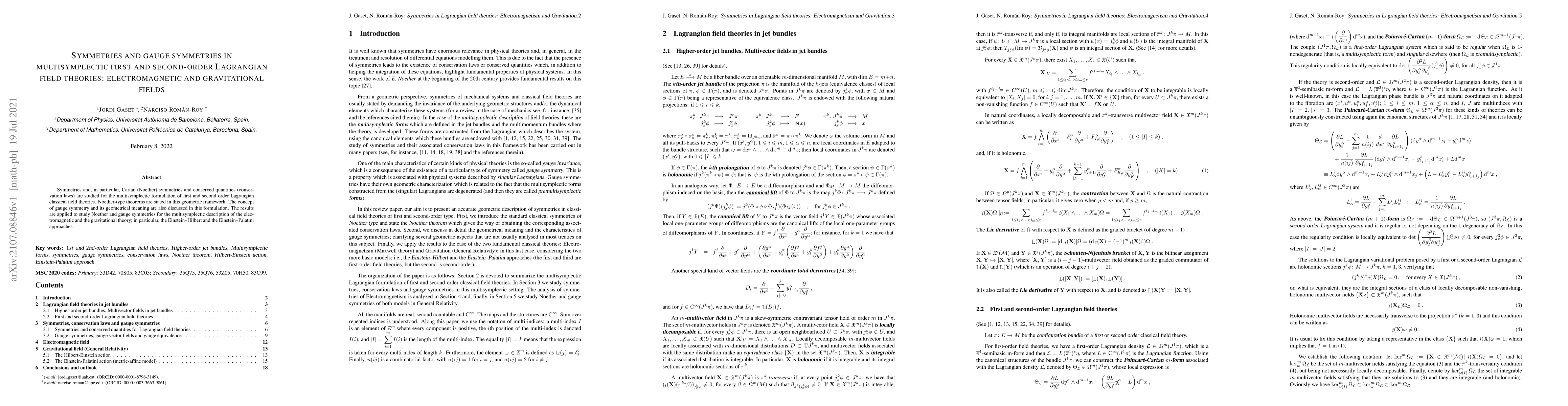 This paper investigates symmetries and gauge symmetries in multisymplectic formulations of first and second-order Lagrangian field theories, focusing on electromagnetic and gravitational fields. It establishes Noether-type theorems and examines the geometric meaning of gauge symmetry, applying these concepts to analyze symmetries in the Einstein-Hilbert and Einstein-Palatini approaches.