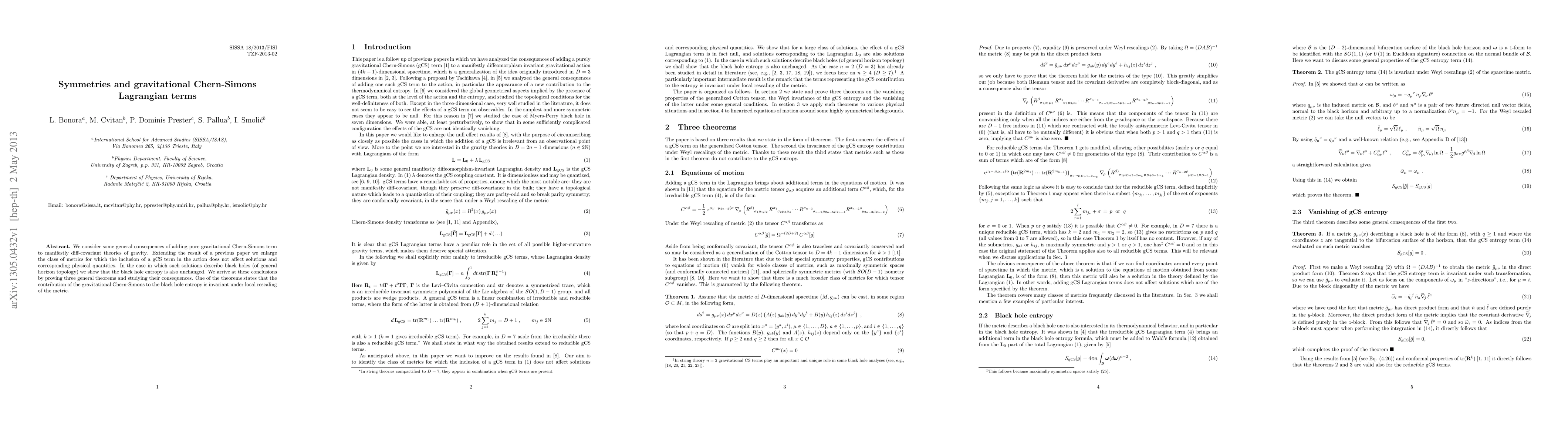 We consider some general consequences of adding pure gravitational Chern-Simons term to manifestly diff-covariant theories of gravity. Extending the result of a previous paper we enlarge the class of metrics for which the inclusion of a gCS term in the action does not affect solutions and corresponding physical quantities. In the case in which such solutions describe black holes (of general horizon topology) we show that the black hole entropy is also unchanged. We arrive at these conclusions by proving three general theorems and studying their consequences. One of the theorems states that the contribution of the gravitational Chern-Simons to the black hole entropy is invariant under local rescaling of the metric.