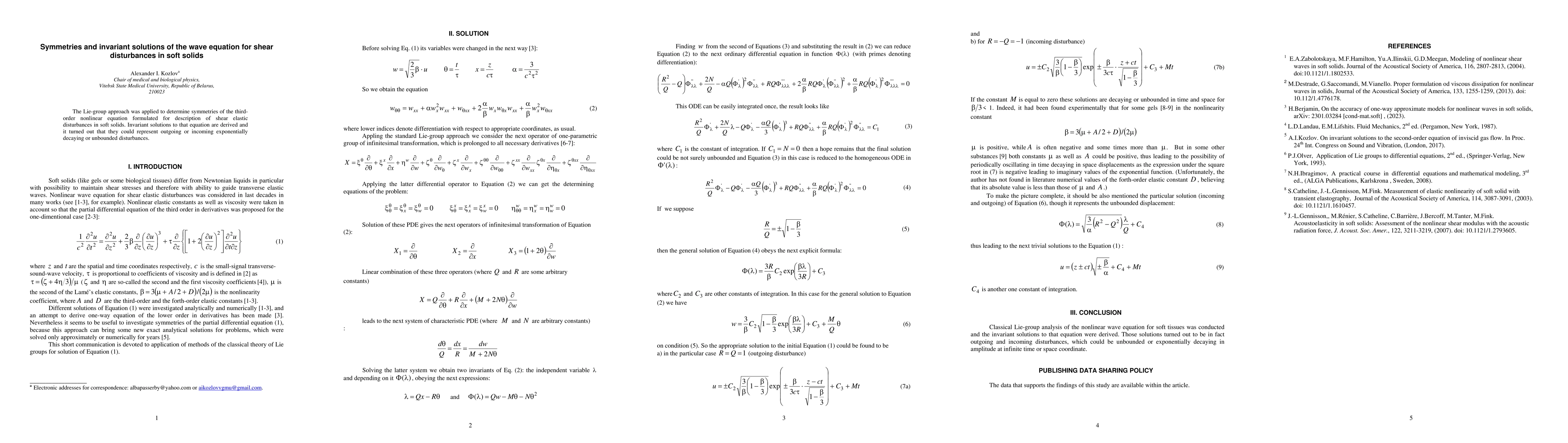 The paper utilizes the Lie-group approach to identify symmetries in a third-order non-linear wave equation for shear disturbances in soft solids, deriving invariant solutions that depict various types of disturbances, including exponentially decaying and unbounded forms.