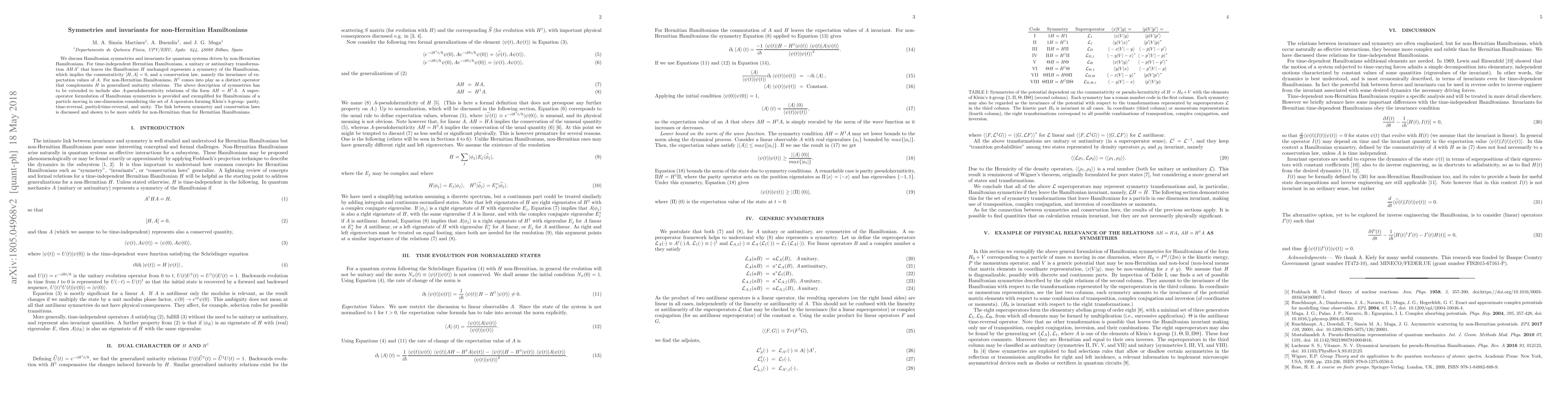 This paper explores symmetries and invariants for quantum systems governed by non-Hermitian Hamiltonians, extending the concept of symmetries to include $A$-pseudohermiticity relations, and provides a superoperator formulation exemplified by a one-dimensional particle system. The link between symmetry and conservation laws is shown to be more nuanced for non-Hermitian systems compared to Hermitian ones.