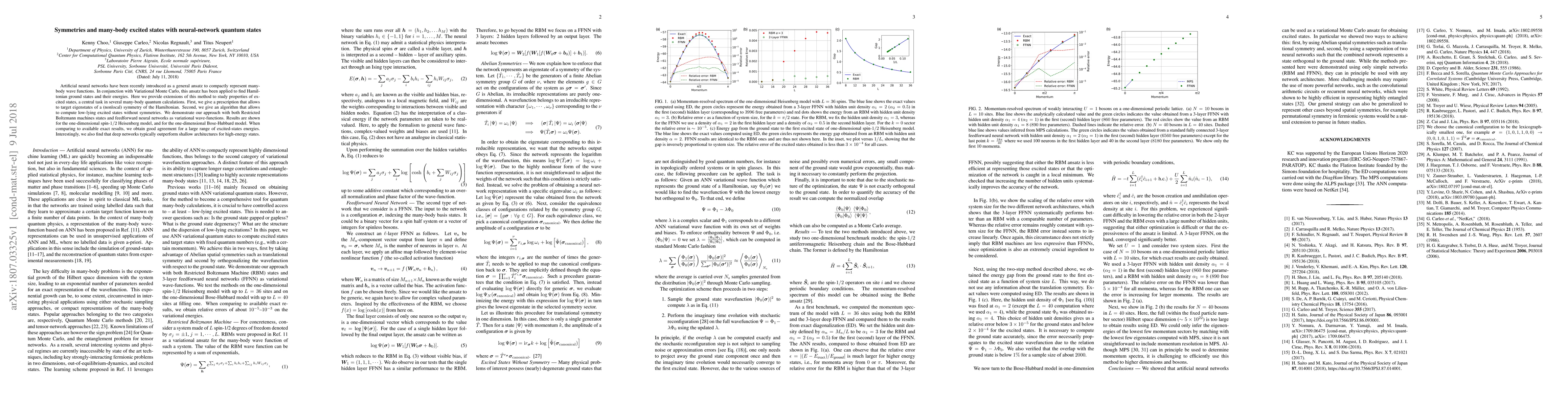 This paper extends neural-network quantum states to study many-body excited states, introducing methods to target symmetry eigenstates and compute low-lying excited states. Results for the spin-1/2 Heisenberg and Bose-Hubbard models show good agreement with exact results, with deep networks outperforming shallow ones for high-energy states.