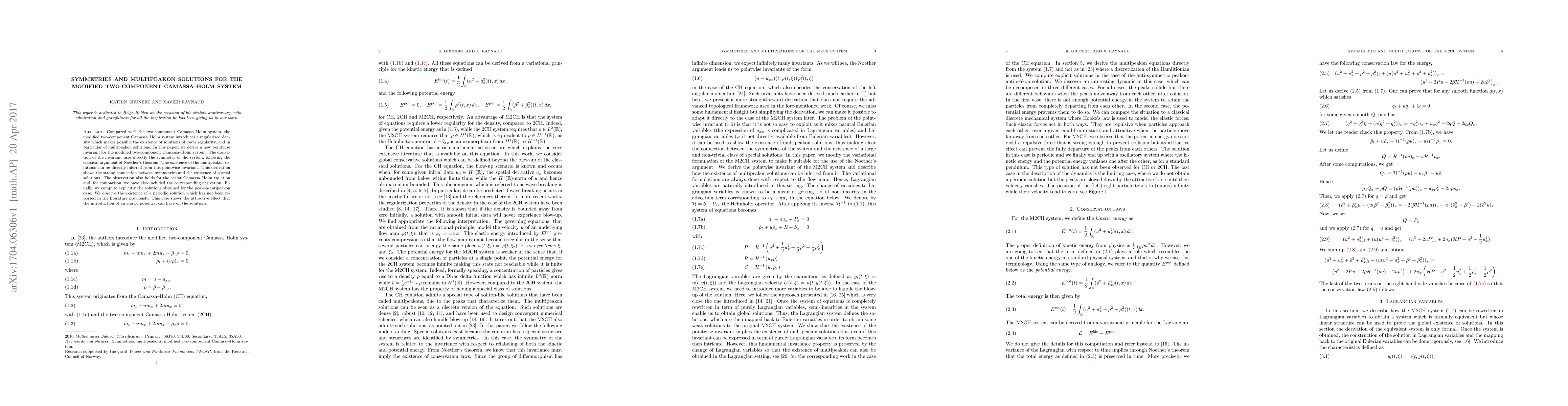 Compared with the two-component Camassa-Holm system, the modified two-component Camassa-Holm system introduces a regularized density which makes possible the existence of solutions of lower regularity, and in particular of multipeakon solutions. In this paper, we derive a new pointwise invariant for the modified two-component Camassa-Holm system. The derivation of the invariant uses directly the symmetry of the system, following the classical argument of Noether's theorem. The existence of the multipeakon solutions can be directly inferred from this pointwise invariant. This derivation shows the strong connection between symmetries and the existence of special solutions. The observation also holds for the scalar Camassa-Holm equation and, for comparison, we have also included the corresponding derivation. Finally, we compute explicitly the solutions obtained for the peakon-antipeakon case. We observe the existence of a periodic solution which has not been reported in the literature previously. This case shows the attractive effect that the introduction of an elastic potential can have on the solutions.