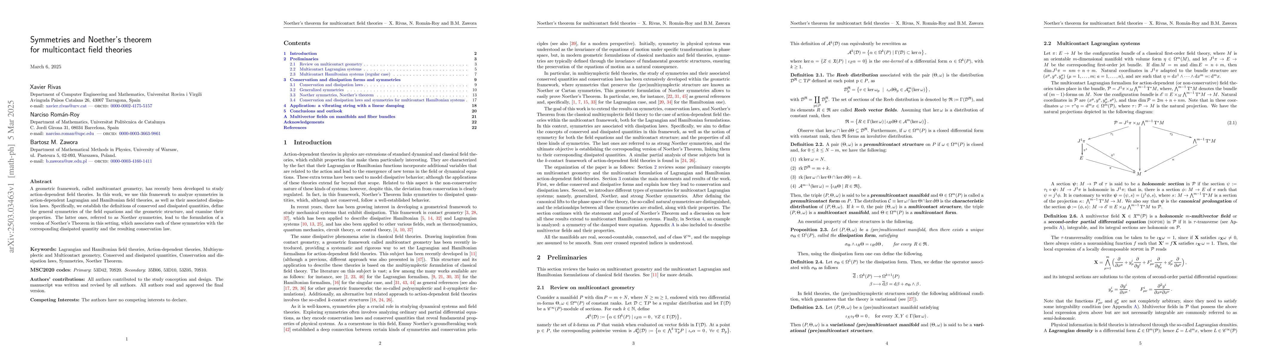 The development of Noether's theorem within the multicontact geometry framework for action-dependent field theories, associating symmetries with dissipated quantities and conservation laws.