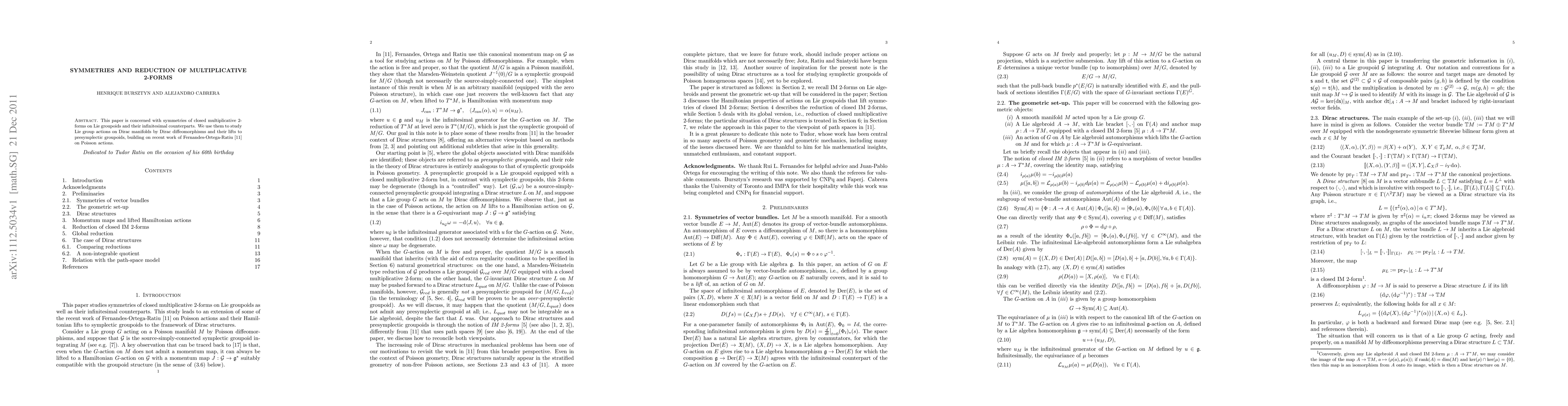 This paper explores symmetries of closed multiplicative 2-forms on Lie groupoids and their infinitesimal versions, applying these to study Lie group actions on Dirac manifolds via Dirac diffeomorphisms and their lifts to presymplectic groupoids, extending the work of Fernandes-Ortega-Ratiu on Poisson actions.