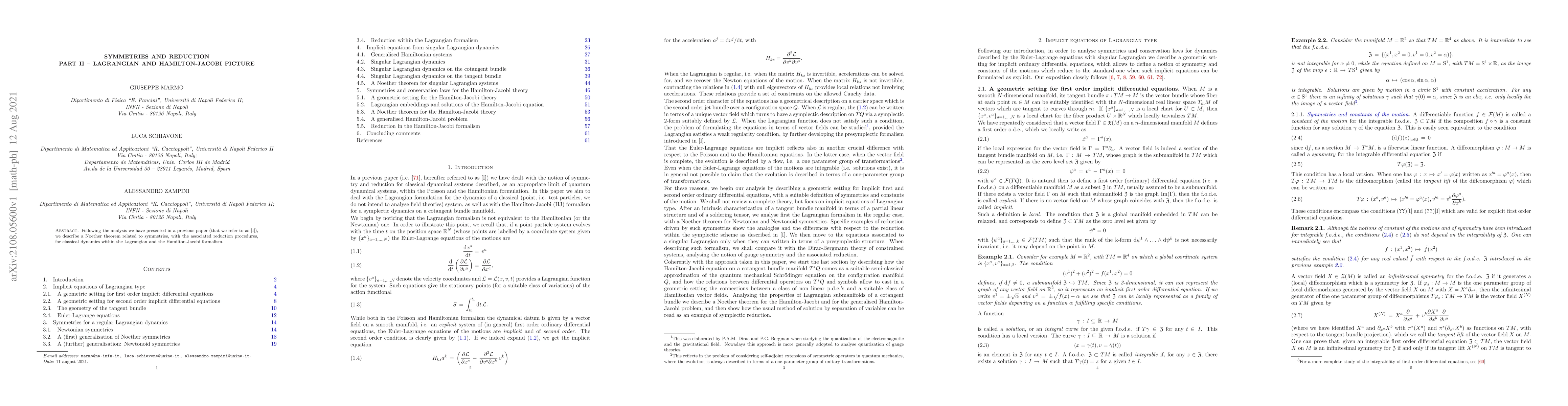 This paper extends the analysis of symmetries and reduction procedures from a previous work, applying Noether's theorem to classical dynamics in both Lagrangian and Hamilton-Jacobi formalisms to simplify and reduce the system.