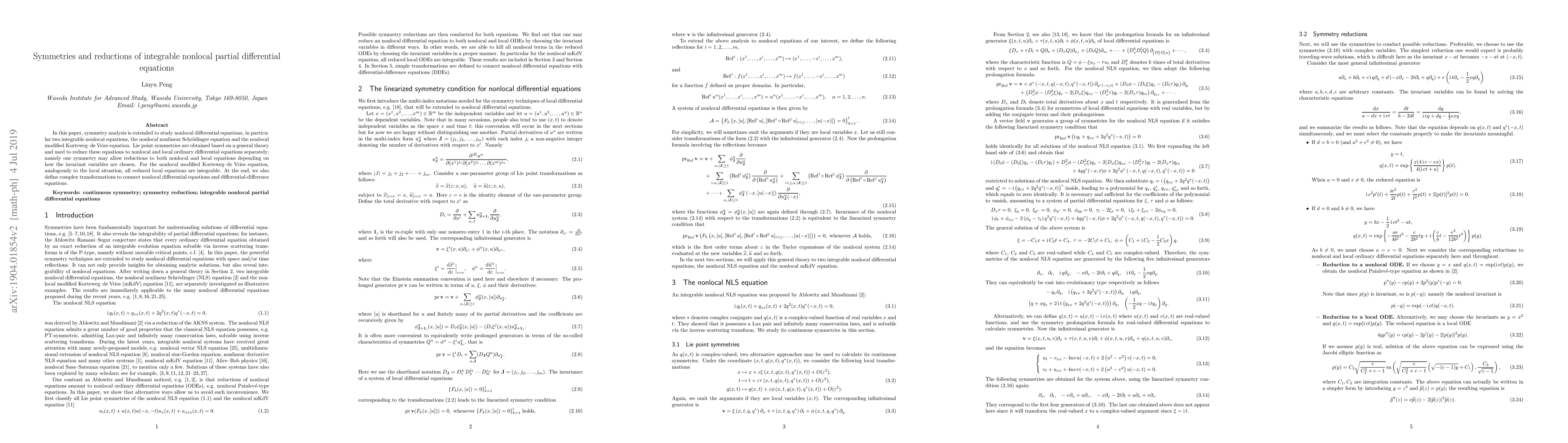 This paper extends symmetry analysis to nonlocal differential equations, focusing on the nonlocal nonlinear Schrödinger and modified KdV equations. It derives Lie point symmetries to reduce these equations to both nonlocal and local ordinary differential equations, demonstrating integrability in the local reductions.