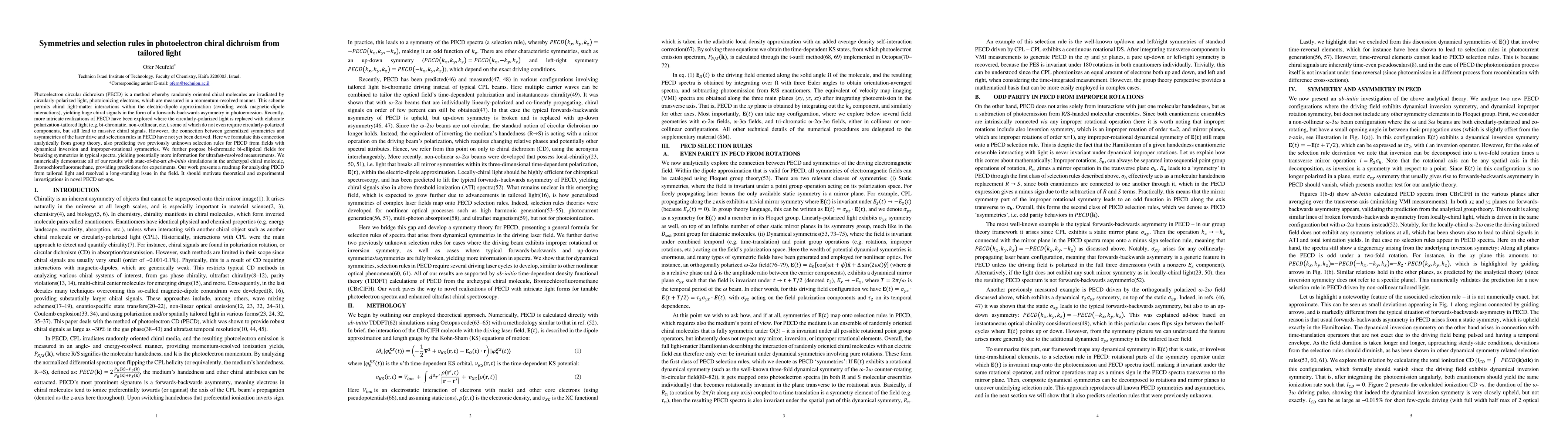 The research uses group theory to formulate the connection between generalized symmetries and asymmetries of the laser drive and selection rules in Photoelectron Circular Dichroism (PECD), supported by ab-initio simulations on the chiral molecule Bromochlorofluoromethane.