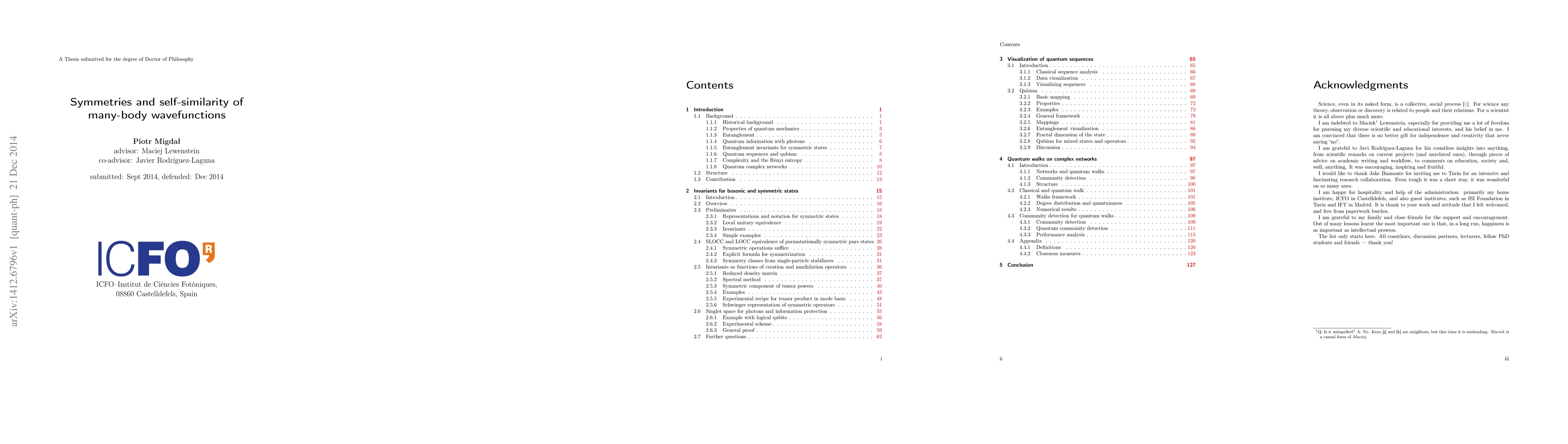 This PhD thesis is dedicated to the study of the interplay between symmetries of quantum states and their self-similar properties. It consists of three connected threads of research: polynomial invariants for multiphoton states, visualization schemes for quantum many-body systems and a complex networks approach to quantum walks on a graph. First, we study the problem of which many-photon states are equivalent up to the action of passive linear optics. We prove that it can be converted into the problem of equivalence of two permutation-symmetric states, not necessarily restricted to the same operation on all parties. We show that the problem can be formulated in terms of symmetries of complex polynomials of many variables, and provide two families of invariants, which are straightforward to compute and provide analytical results. Second, we study a family of recursive visualization schemes for many-particle systems, for which we have coined the name 'qubism'. While all many-qudit states can be plotted with qubism, it is especially useful for spin chains and one-dimensional translationally invariant states. This symmetry results in self-similarity of the plot, making it more comprehensible and allowing to discover certain structures. Third, we study quantum walks of a single particle on graphs, which are classical analogues of random walks. Our focus is on the long-time limit of the probability distribution and we study how (especially in the long-time limit) off-diagonal elements of the density matrix behave. We use them to perform quantum community detection - splitting of a graph into subgraphs in such a way that the coherence between them is small. Our method captures properties that classical methods cannot - the impact of constructive and destructive interference, as well as the dependence of the results on the tunneling phase.